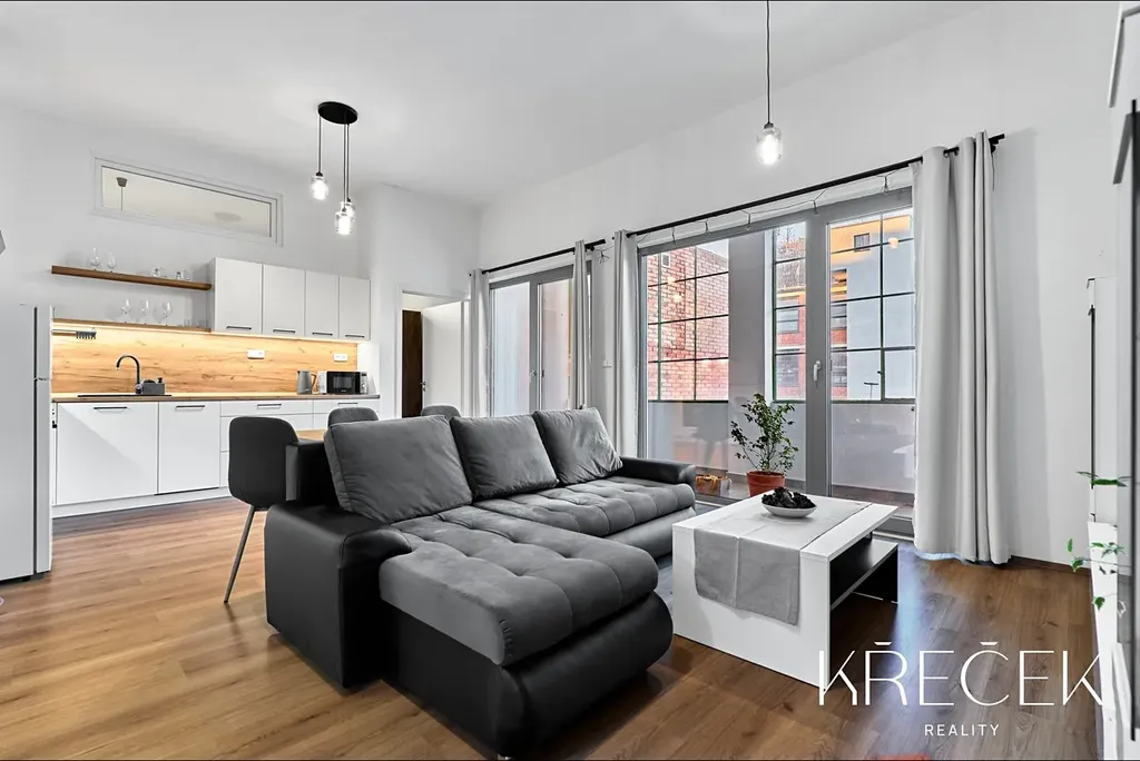 Interiér působí moderně a čistě. Kuchyňská linka na míru prakticky využívá prostor a nabízí dostatek úložných i pracovních ploch. Byt je velmi světlý díky velkým hliníkovým francouzským oknům a vysoké stropy dodávají pocit vzdušnosti a otevřenosti.