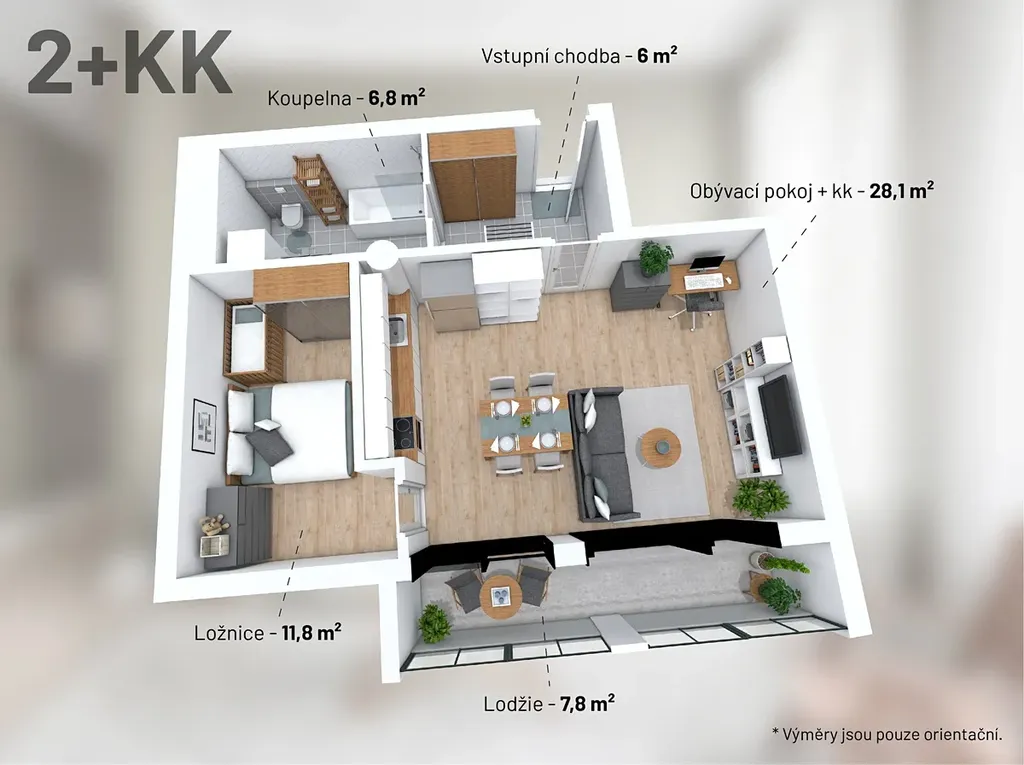 Byt 2+kk o rozloze 55 m² se nachází ve 2. nadzemním podlaží. Ze zádveří vstoupíte do obytné části s kuchyňským koutem a následně do samostatného pokoje; ze zádveří je přístupná také koupelna. K bytu patří prostorná sklepní kóje na stejném podlaží a lodžie o 8 m². V ceně nájmu je zahrnuto i garážové parkovací stání.