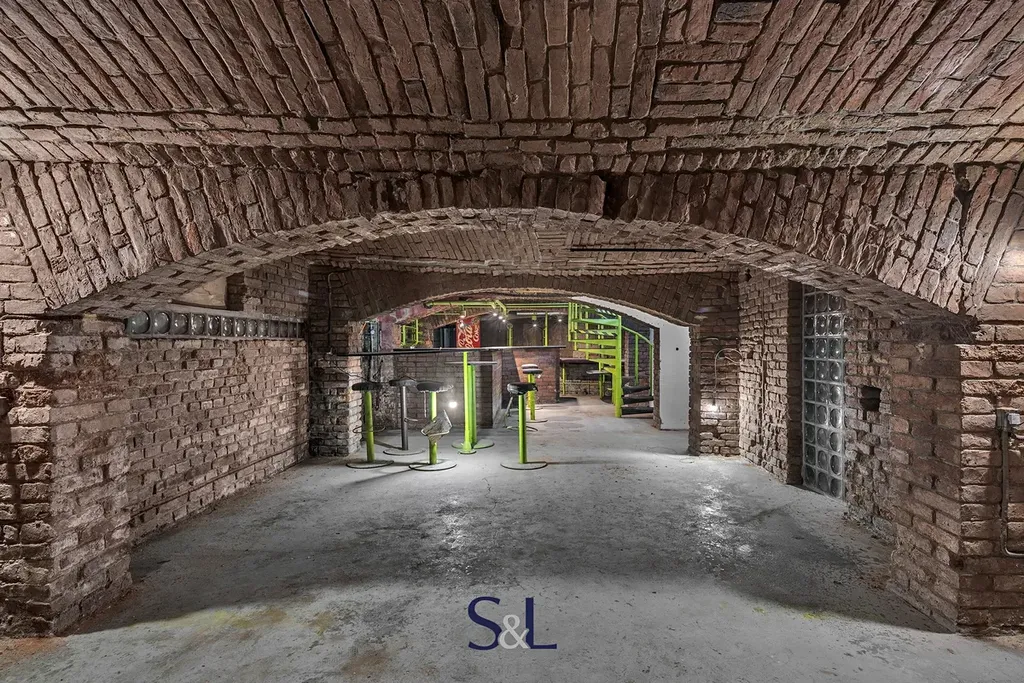 - Suterén (1. PP): hlavní sál s klenutými stropy, ideální pro klubový prostor, menší sál vhodný pro další zázemí nebo oddělenou místnost, sklady, technická místnost s kotelnou a další prostory pro provozní zázemí.