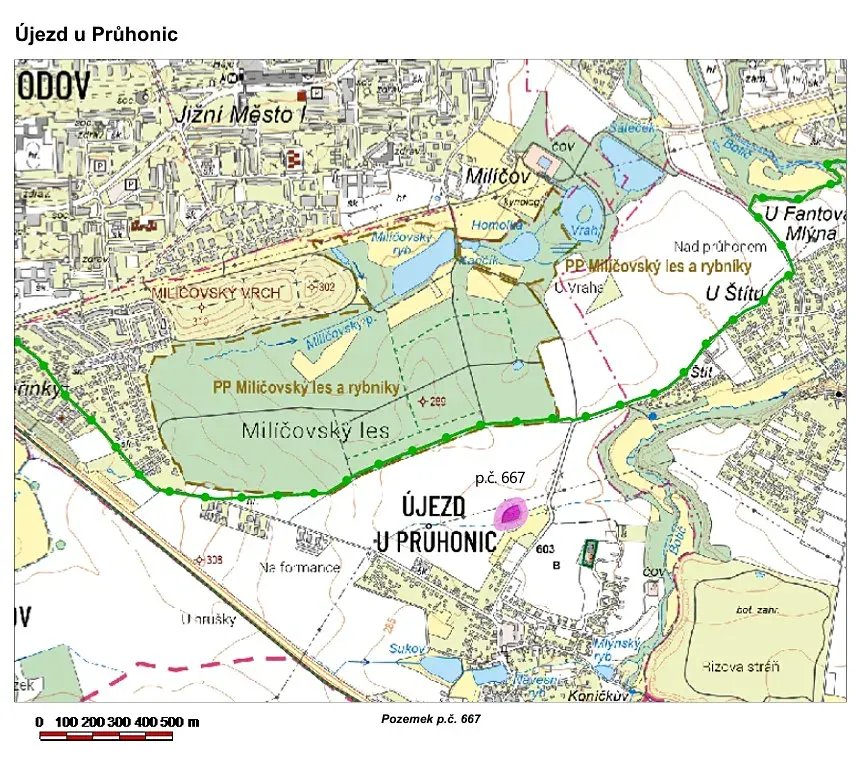 Lesní pozemek p.č. 667 tvoří ojedinělou zeleň v komplexu rozšiřující se bytové a komerční zástavby podél dálnice D1 a je zcela obklopen zemědělskou půdou. Ze severní strany do pozemku zasahuje ochranné pásmo elektrovodu.
