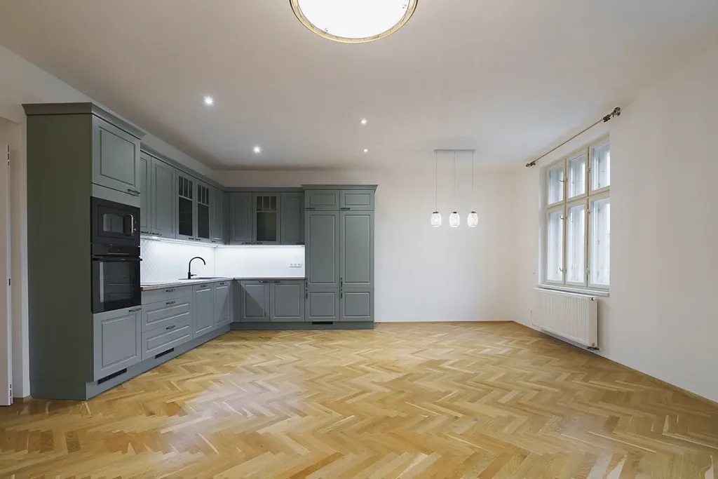 • Při rekonstrukci byly použity vysoce kvalitní materiály se zachováním původních historických prvků, které dodávají bytu charakter a eleganci.