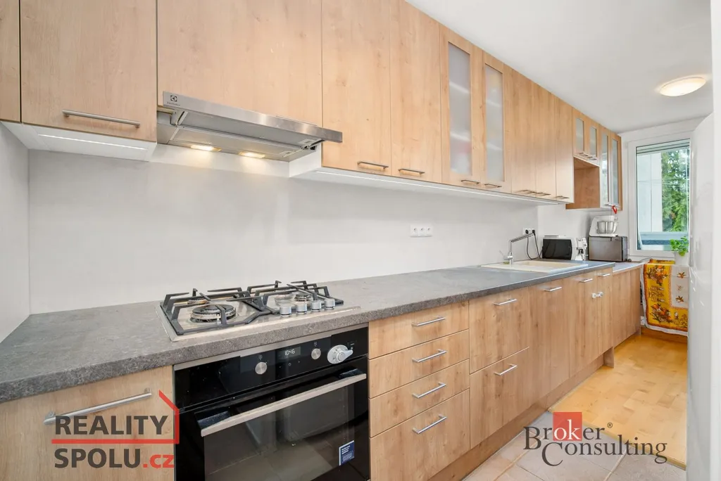 Dispozice bytu umožňuje jednoduchou úpravu na 3+1, pokud by novému majiteli vyhovoval oddělený kuchyňský prostor. Kuchyňská linka je z roku 2019, doplněná v roce 2022 o další úložné prostory a police. V bytě zůstávají také vestavné spotřebiče Electrolux a dále vestavné skříně a knihovny na míru v chodbě a ložnici. V roce 2020 byly instalovány nové bezpečnostní dveře se zárubní. Podlahy tvoří kombinace masivní plovoucí podlahy, dlažby a lina.