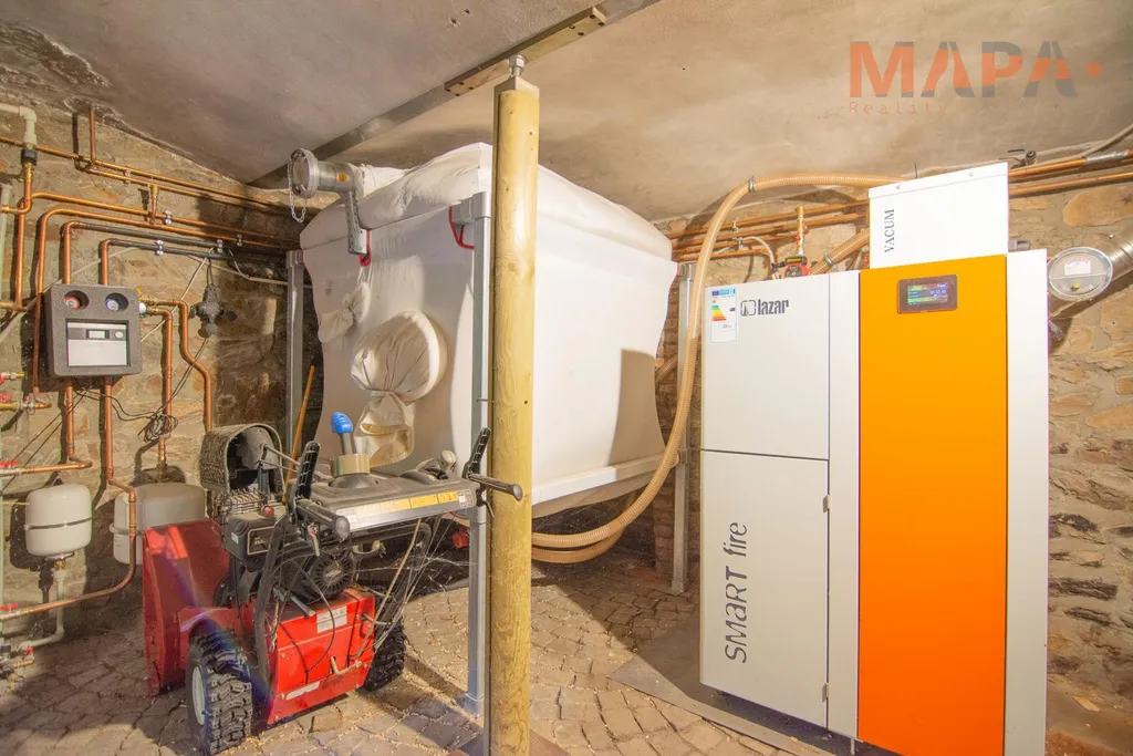 Topení: nový automatický kotel na pelety se zásobníkem (kapacita až 1,9 tuny).