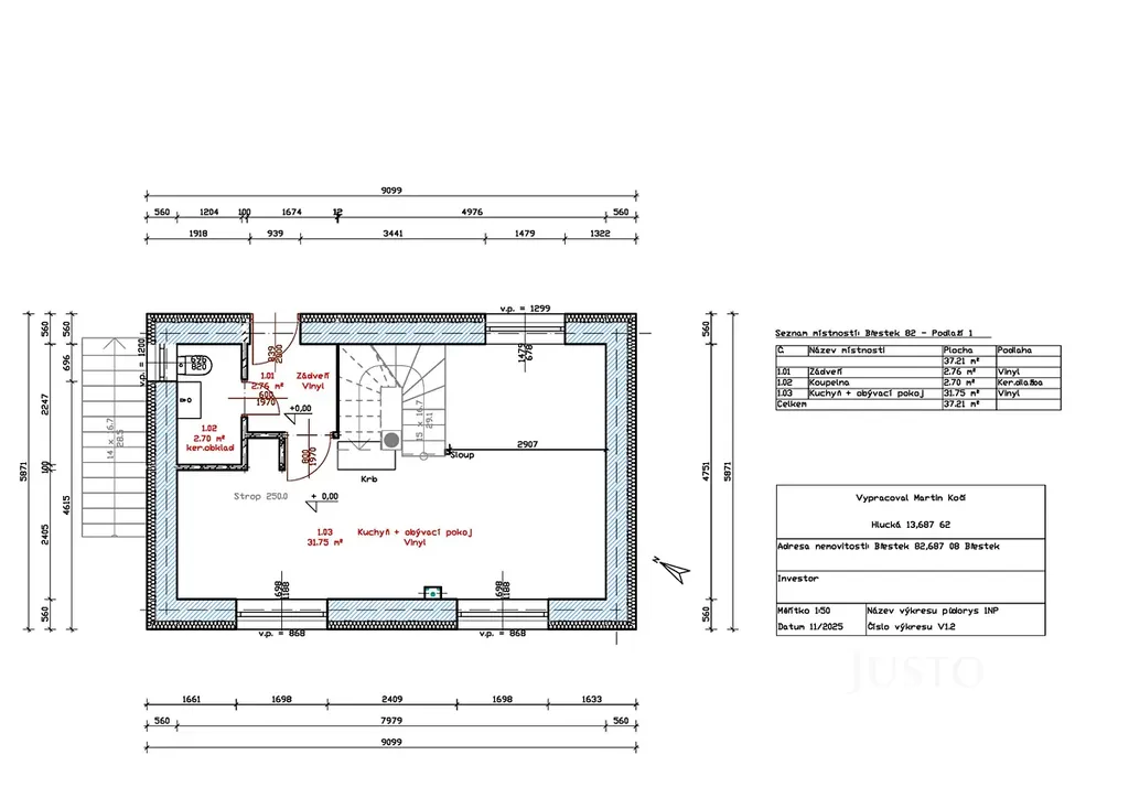 - v 1. NP je předsíň, koupelna se sprchovým koutem a WC, obývací pokoj s kuchyňským koutem a krbem, užitná plocha 1.NP je 37,21 m²