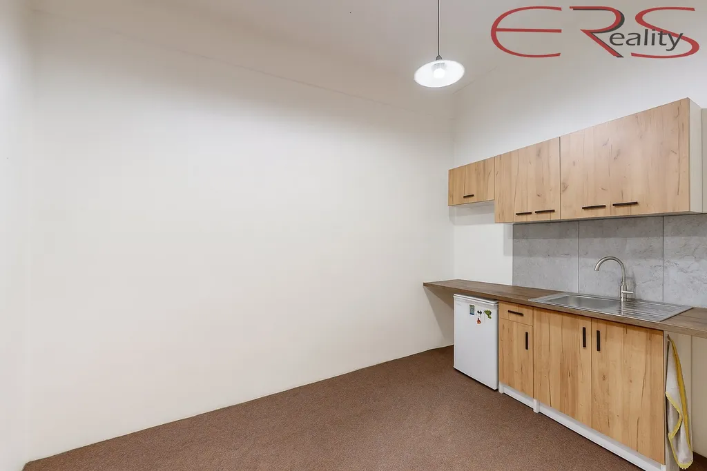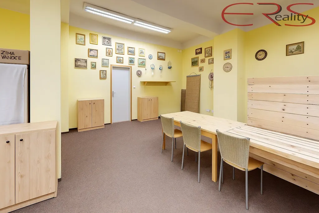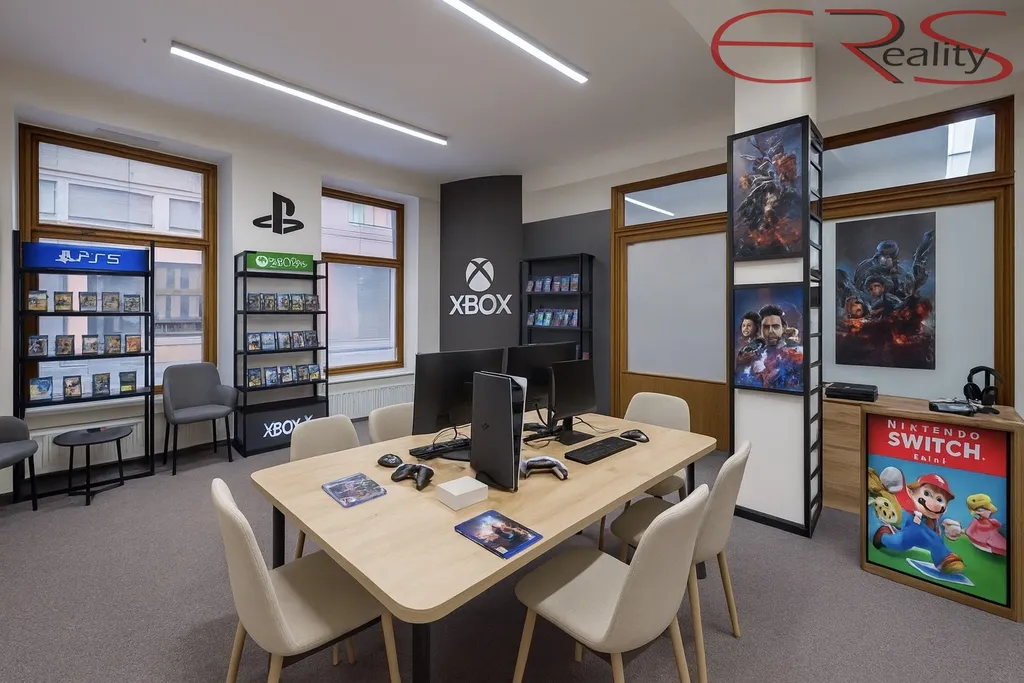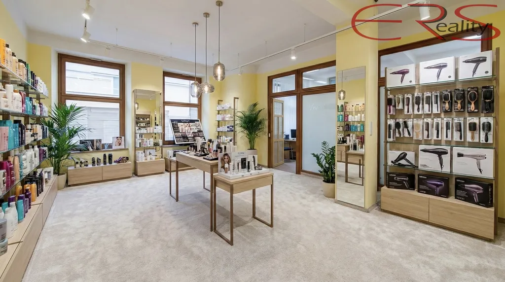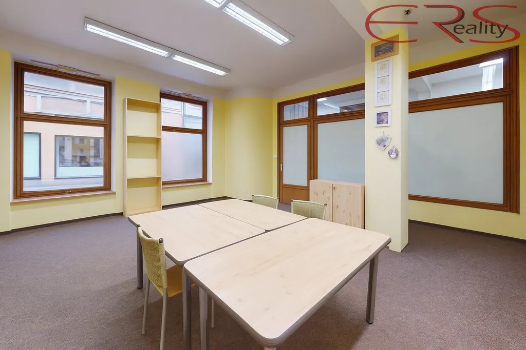 hlavní místnost o ploše cca 33,7 m² s výlohami do ulice, navazující zázemí cca 8,3 m² (samostatná místnost s kuchyňským koutem pro zázemí personálu). Praktické uspořádání, vysoké stropy a dostatek denního světla.
