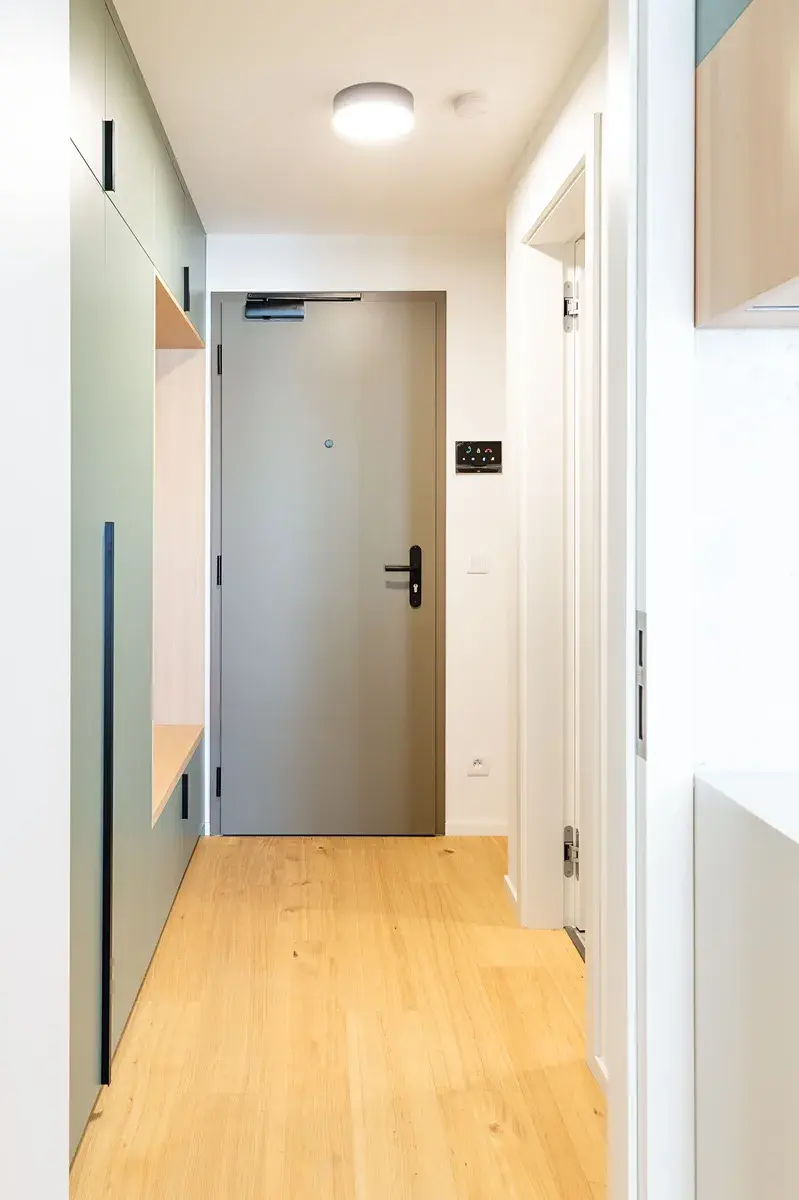 Vybavení bytu: předsíň s praktickými úložnými prostory, kuchyňská linka na míru se spotřebiči (lednice s mrazákem, trouba, varná deska, digestoř, myčka), pračka, postel bez matrace a obývací stěna na míru. Byt bude také dovybaven venkovními black-out žaluziemi.