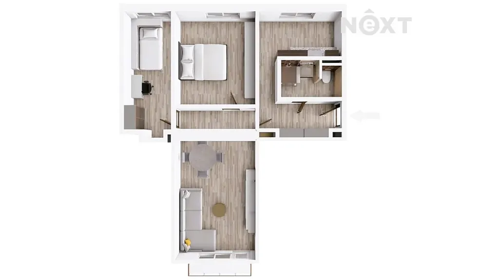 V bytě je k dispozici vstupní chodba (3,78 m2), z ní je vstup do koupelny (3,05 m2) se sprchou, umyvadlem a toaletou, dále do kuchyně (9,57 m2) a do prostorného průchozího obývacího pokoje (21,87 m2), který vytváří hlavní středobod celého obytného prostoru. Odtud následují jednotlivé vstupy do ložnice (13,21 m2) a pokoje (9,21 m2). Zároveň na obývací pokoj navazuje vstup na balkón (2,58 m2), ze kterého je okouzlující pohled na celé město a na okolní zalesněné kopce.