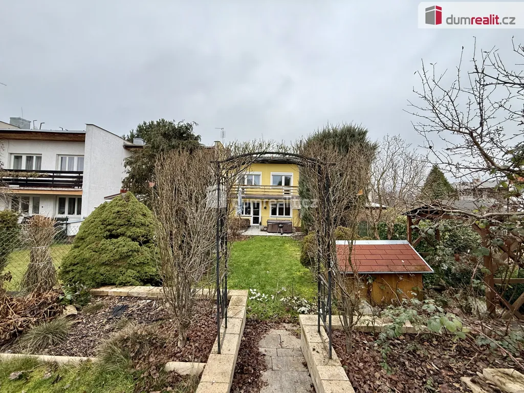 Zahrada je udržovaná s vzrostlými dřevinami.