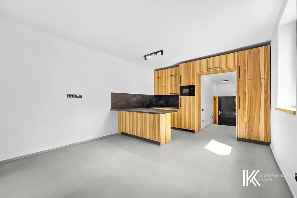 Menší apartmán má samostatný vstup ze zadní části domu. Za vstupem se nachází technická místnost a koupelna. Hlavní obytný prostor je situovaný o pár schodů výše, kde se nachází kuchyňský kout spojený s jídelní a obývací částí. Zadní část místnosti je opět oddělena designovými posuvnými dveřmi a poslouží tak jako útulná ložnice.