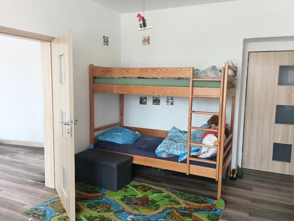 Byt se nachází ve vyvýšeném přízemí a disponuje velmi praktickým dispozičním řešením. Čtyři prostorné a světlé pokoje nabízejí dostatek prostoru pro komfortní rodinné bydlení. K dispozici jsou dvě koupelny, což výrazně zvyšuje uživatelský komfort. Kuchyně je vybavena nadčasovou kuchyňskou linkou s velkou pracovní plochou a dostatkem úložných prostor. Příjemné propojení kuchyně s jídelnou a obývacím pokojem vytváří harmonický otevřený prostor ideální pro rodinný život i setkávání s přáteli.