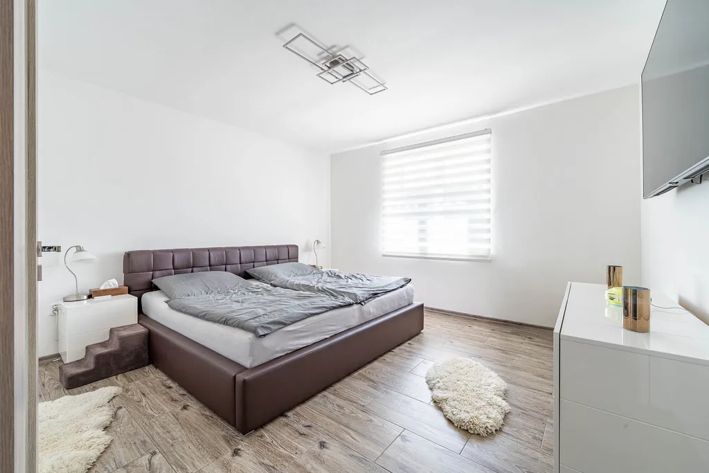 Uvítá vás prostorná předsíň s mnoha úložnými možnostmi a vstupem do technické místnosti, kde se nachází nový kondenzační kotel, pračka, sušička a bojler. Centrální hala se skříněmi na míru propojuje všechny místnosti domu – ložnici, hostinský pokoj, šatnu (kterou lze přeměnit na další pokoj), koupelnu s velkým sprchovým koutem i samostatné WC.