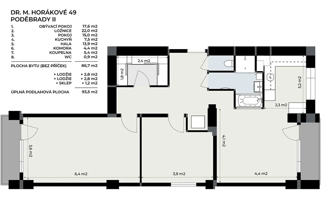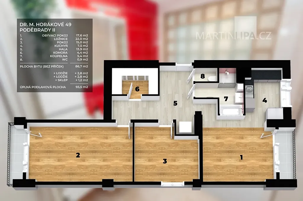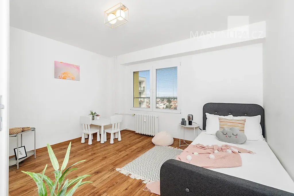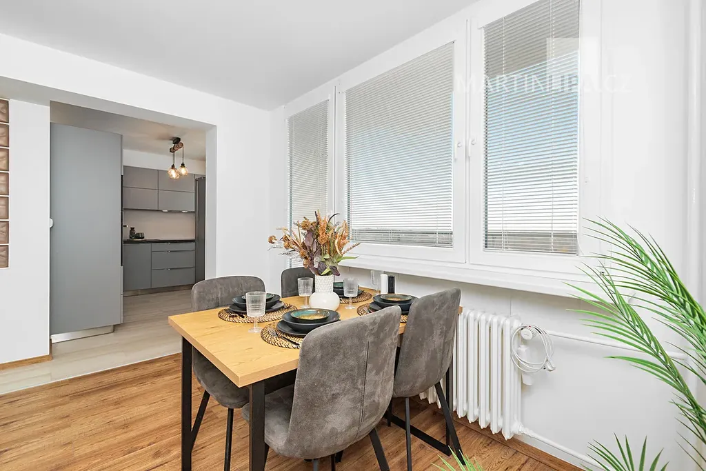 Jsme v Poděbradech, v bytě 3+1 o užitné ploše přes 86 metrů, s příslušenstvím dokonce 94. Po kompletní moderní rekonstrukci, v jedenáctém - předposledním - patře zatepleného panelového domu. V praxi to znamená: spousta světla, výhledy, ticho – a žádné starosti.