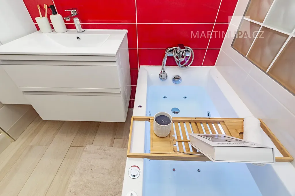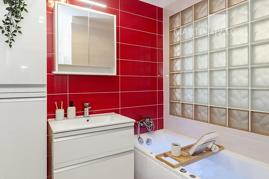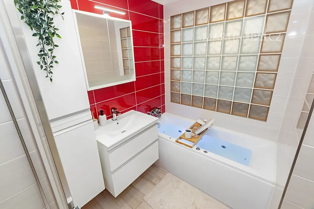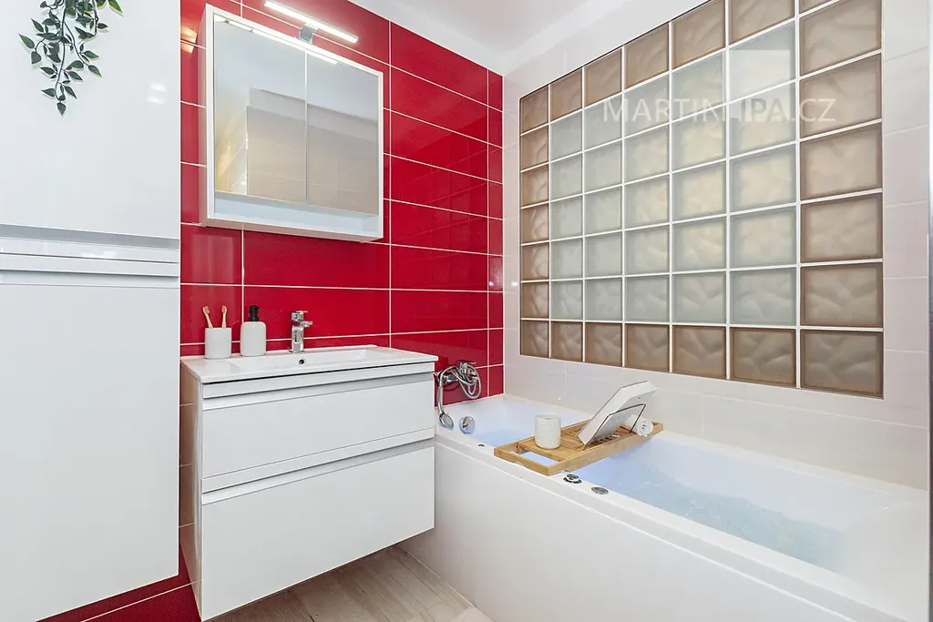 Domácí wellness, nebo, chcete-li, koupelna. Dominantní červenobílé obklady, skleněná stěna z luxfer, skříňka s umyvadlem a hlavně masážní vana s podsvícenou vodou. Stačí napustit, zapálit svíčku a máte večerní spa. Pokud není čas na dlouhý relax, je tu velký sprchový kout a žebříkový radiátor.