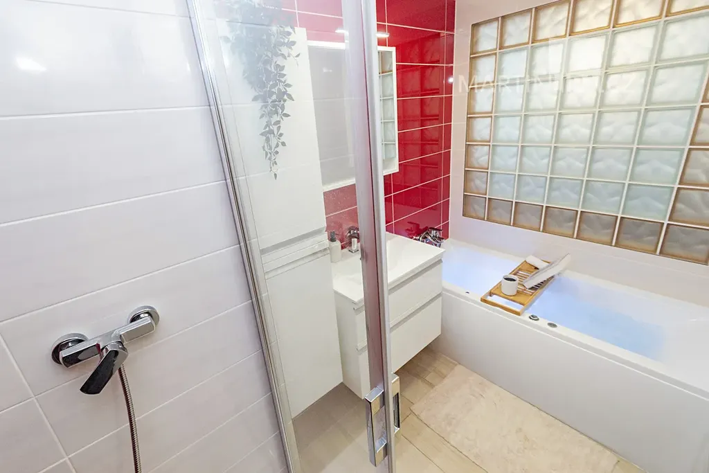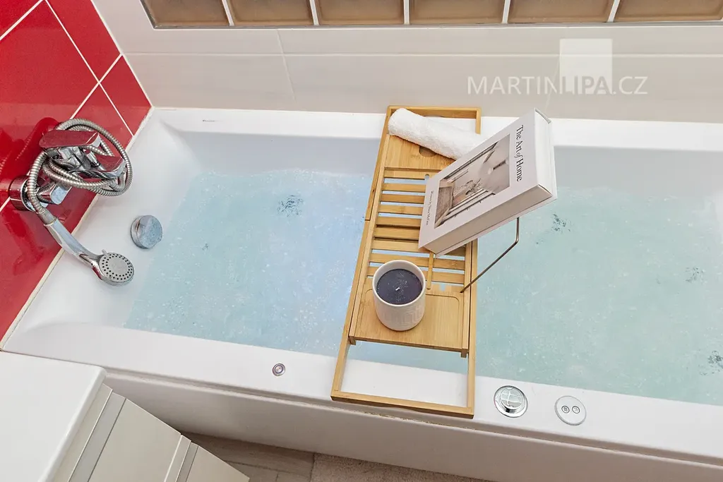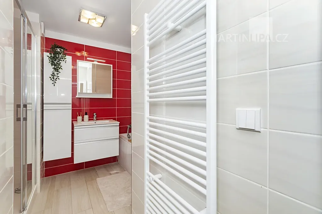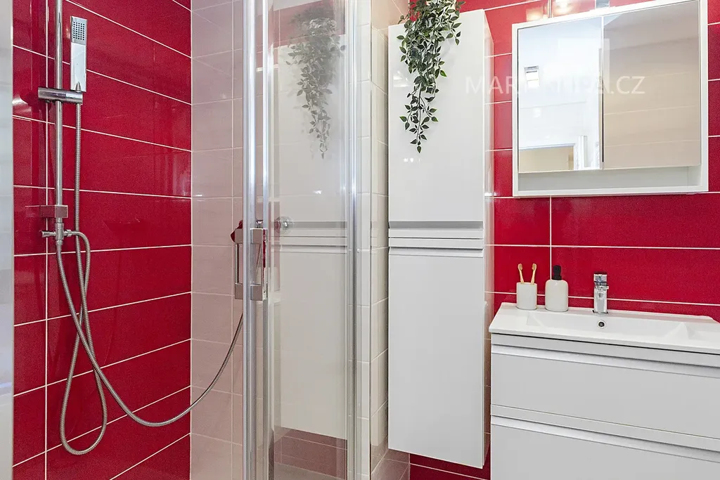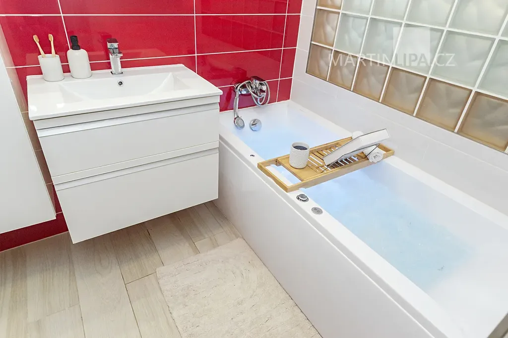 Domácí wellness, nebo, chcete-li, koupelna. Dominantní červenobílé obklady, skleněná stěna z luxfer, skříňka s umyvadlem a hlavně masážní vana s podsvícenou vodou. Stačí napustit, zapálit svíčku a máte večerní spa. Pokud není čas na dlouhý relax, je tu velký sprchový kout a žebříkový radiátor.