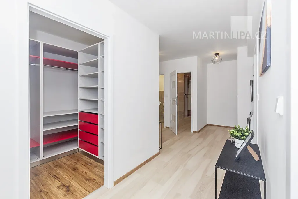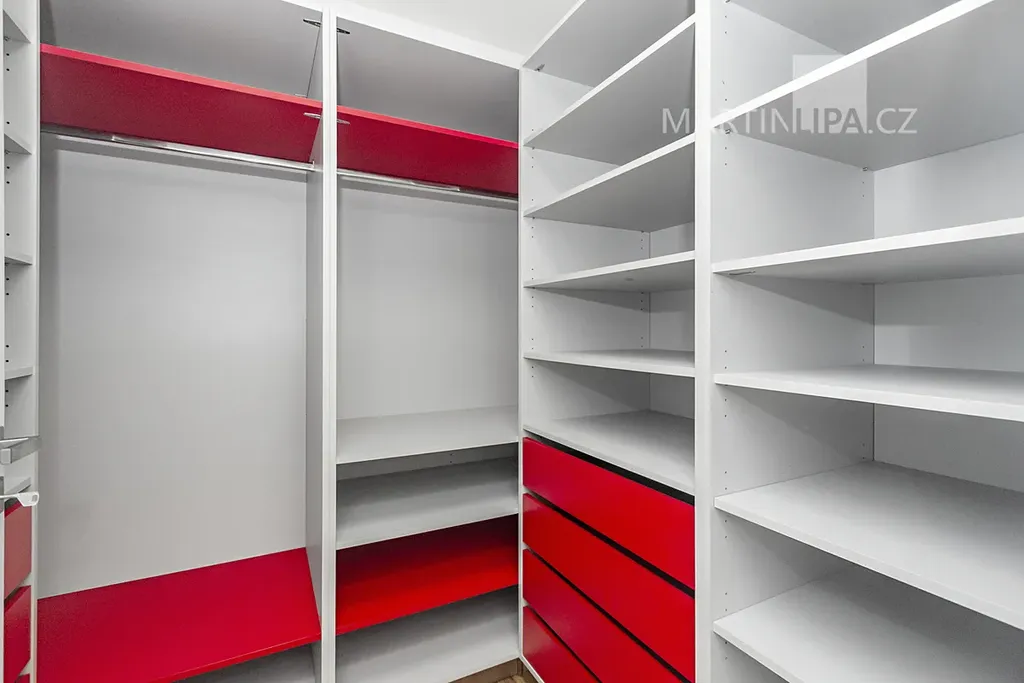 Z haly se dostanete do místnosti, která spoustě lidí splní velký sen – šatnu. Skutečnou walk-in šatnu se systémem polic, zásuvek a věšáků, kam schováte sezónní oblečení, kufry i sportovní vybavení, a byt přesto působí uklizeně.