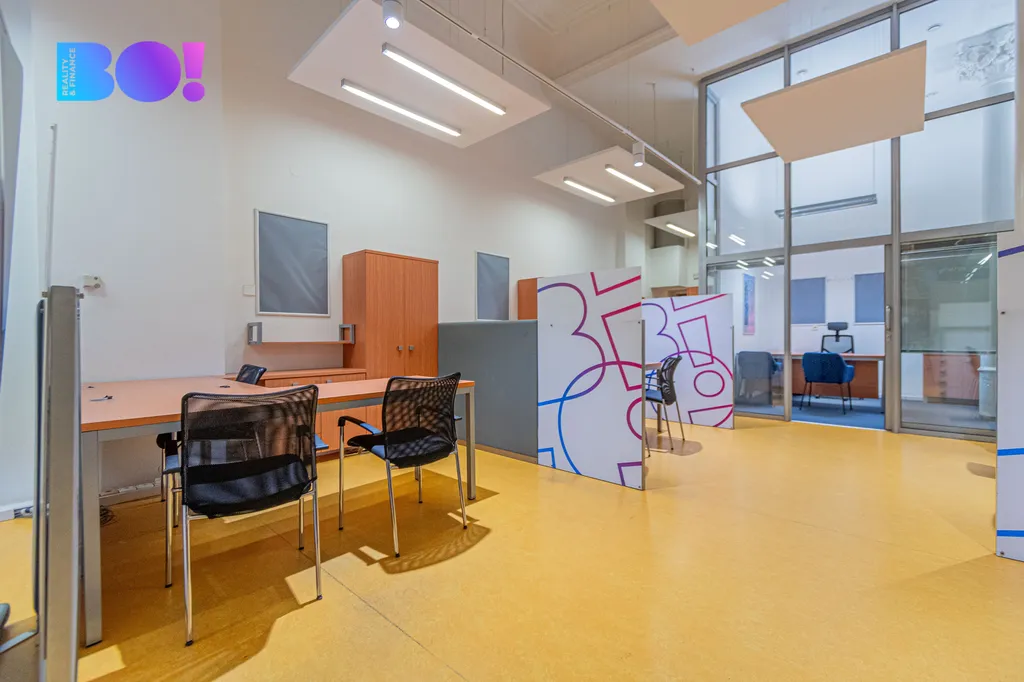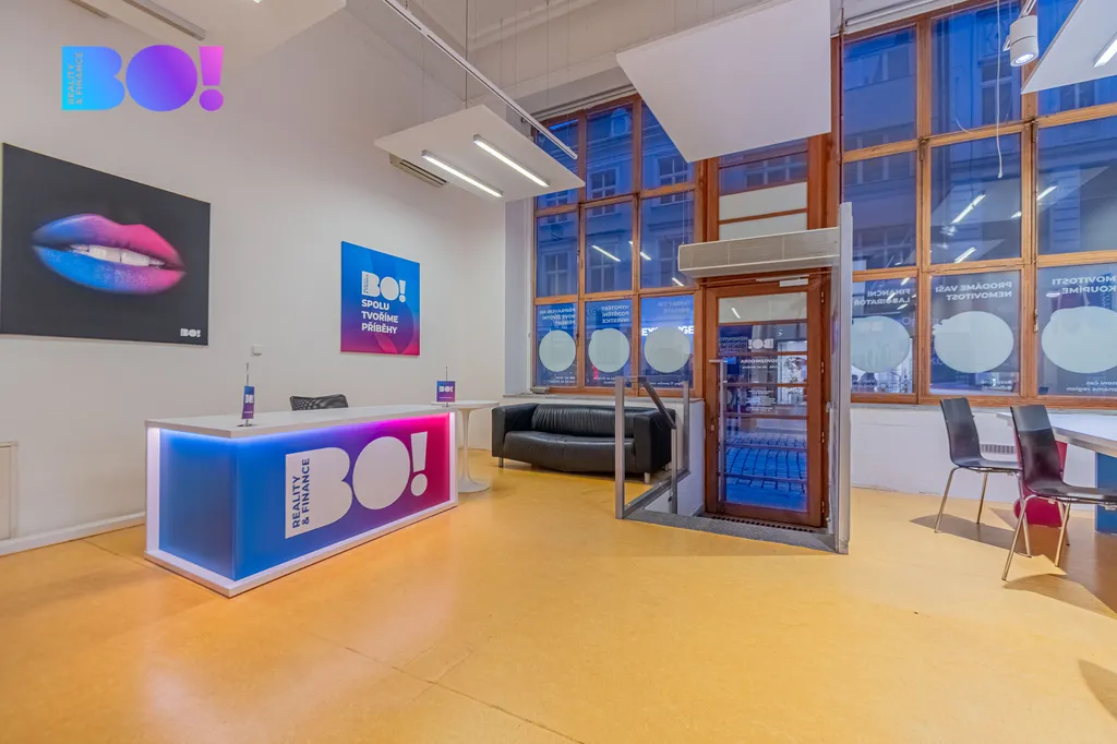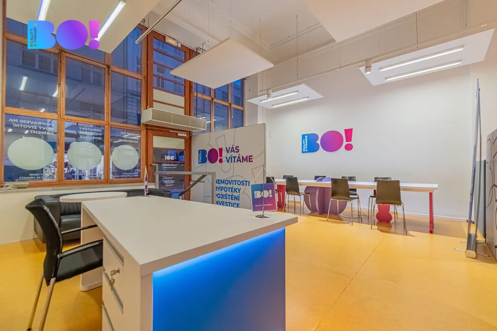 Přední část o velikosti 76 m² nabízí otevřené obchodní či kancelářské prostory. Včetně stolů, skříní a židlí. Do prostoru vniká přes velká přední okna dostatek denní světla. Tyto prostory je možné chladit klimatizačními jednotkami. Na konci tohoto prostoru je prosklená kancelář, která má přehled na zbytek prostorů a dříve sloužila jako kancelář ředitele banky.