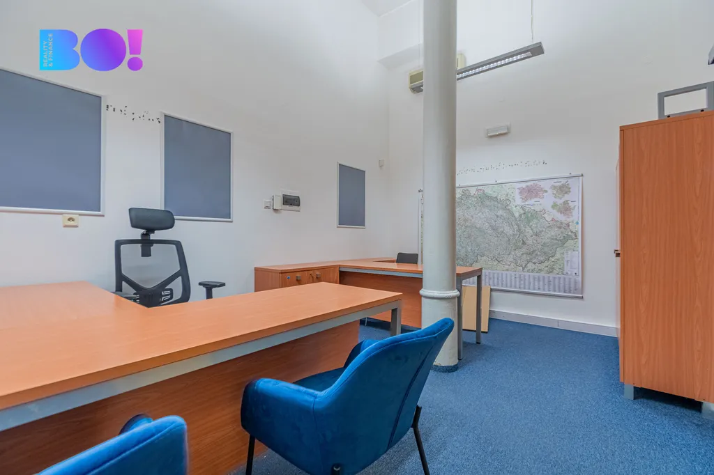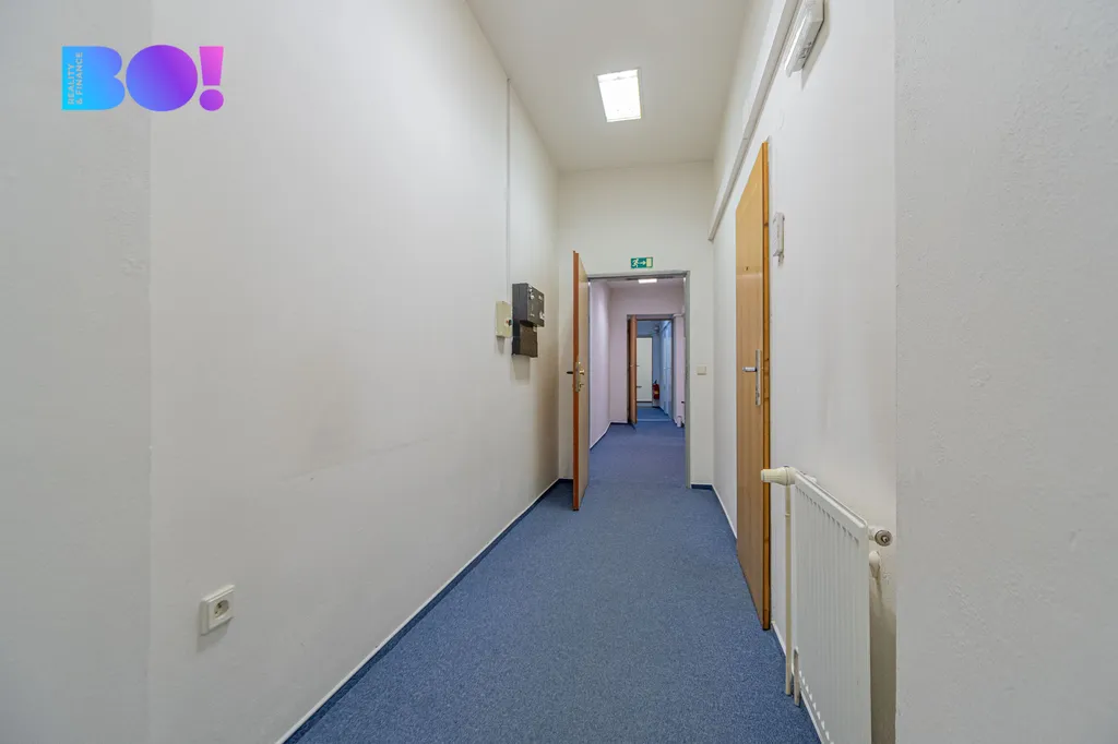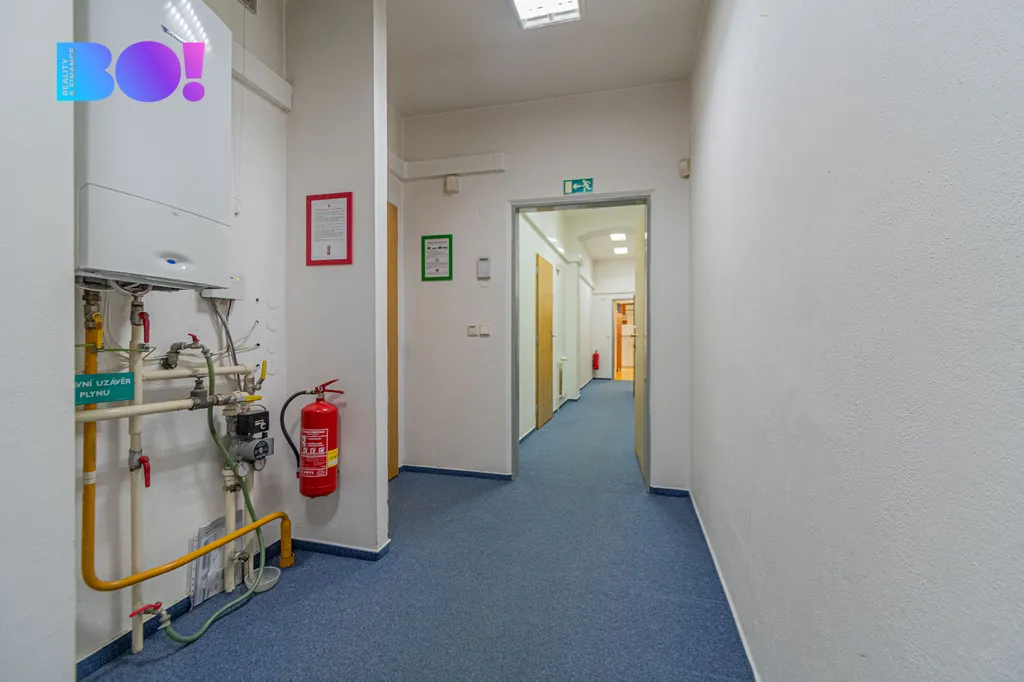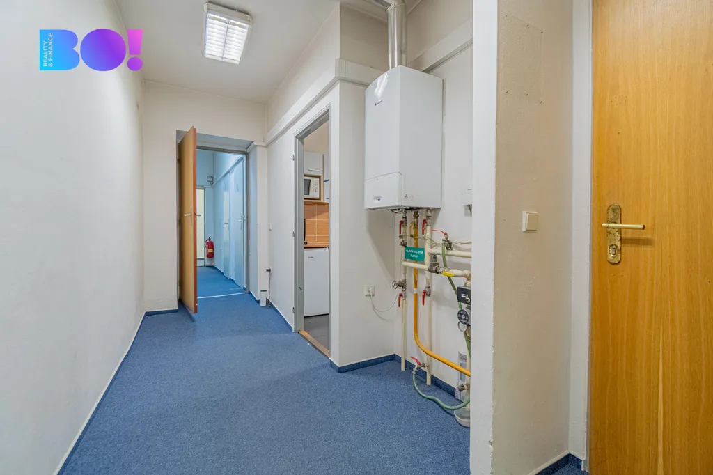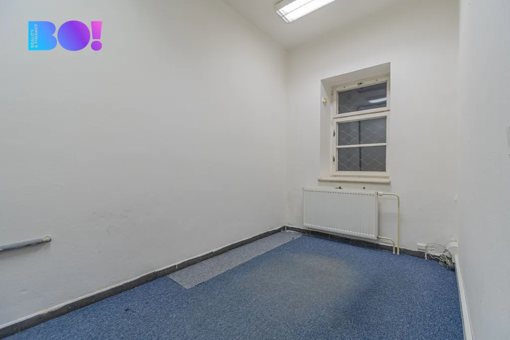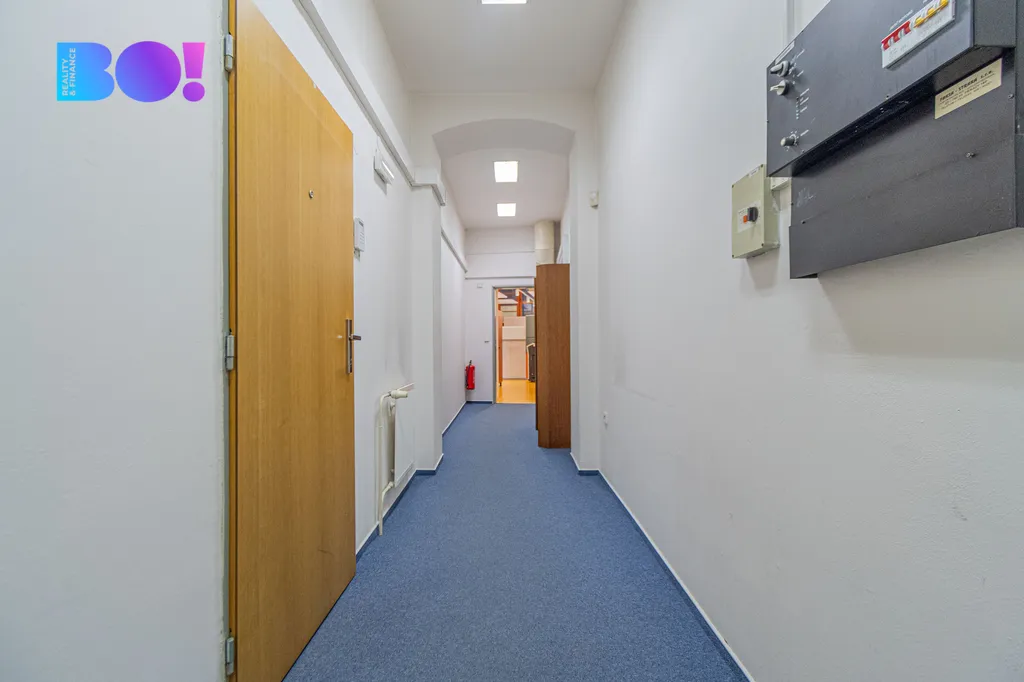 V zadní části o velikosti 73 m² jsou dvě menší samostatné kanceláře či místnosti na jednání (s jedním trezorem). Dále pak kuchyňka s myčkou, dvě WC (muži, ženy), sprchový kout. Do této zadní části vede i druhý bezbariérový vstup přes vnitřní uzamykatelný trakt. Zde je možné uschovat kola či elektro koloběžky.