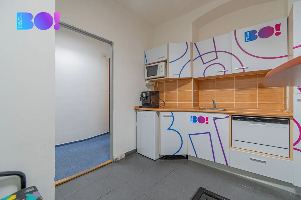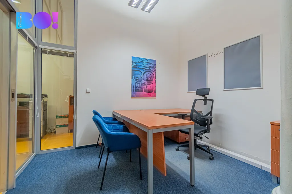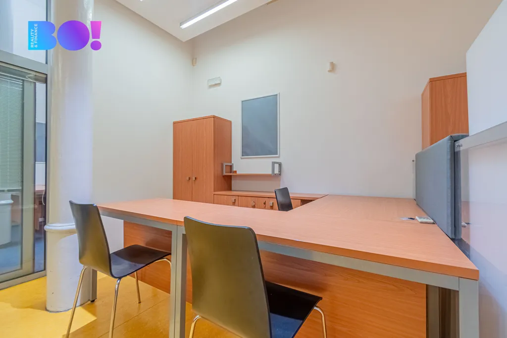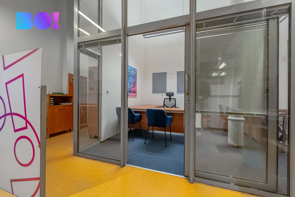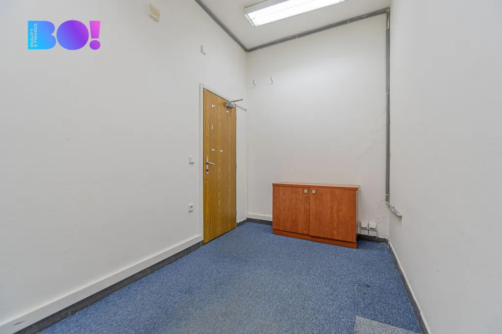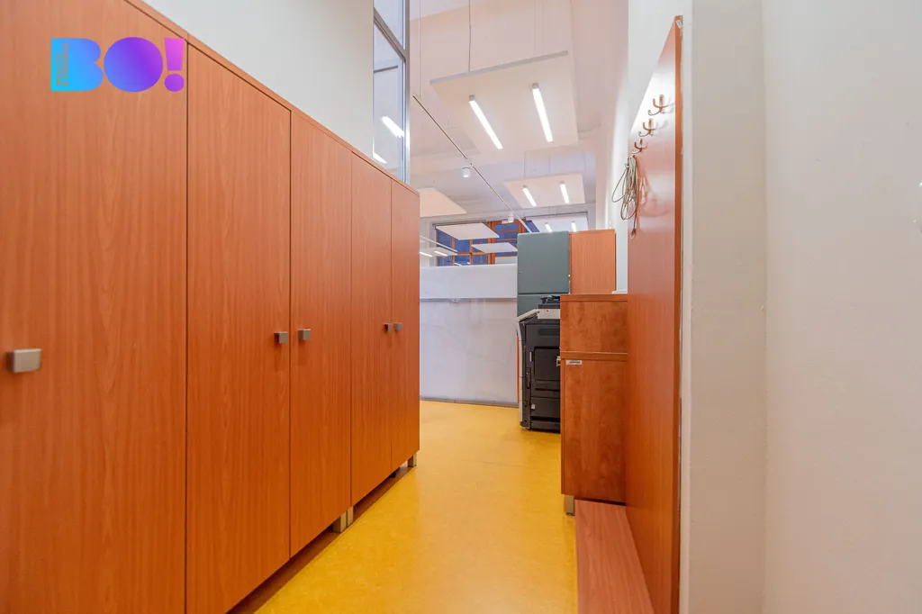 V zadní části o velikosti 73 m² jsou dvě menší samostatné kanceláře či místnosti na jednání (s jedním trezorem). Dále pak kuchyňka s myčkou, dvě WC (muži, ženy), sprchový kout. Do této zadní části vede i druhý bezbariérový vstup přes vnitřní uzamykatelný trakt. Zde je možné uschovat kola či elektro koloběžky.