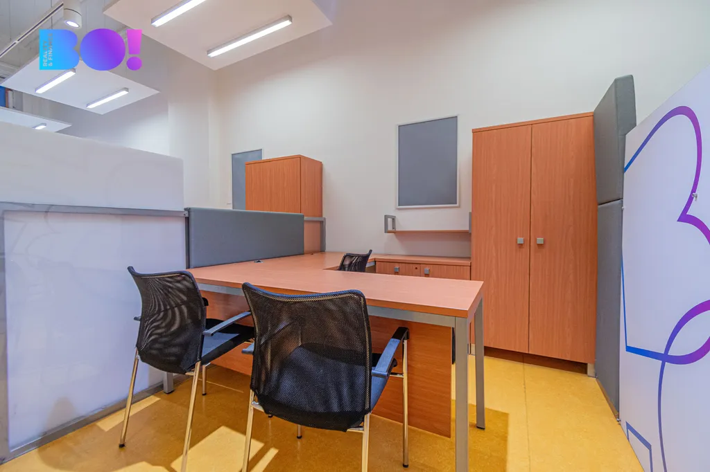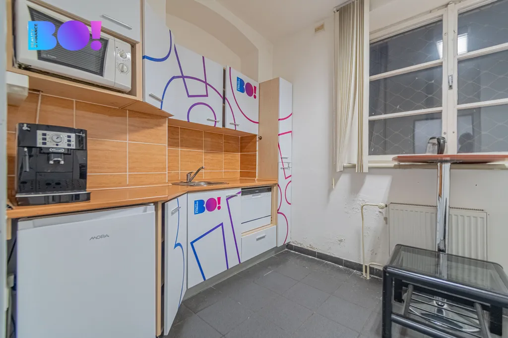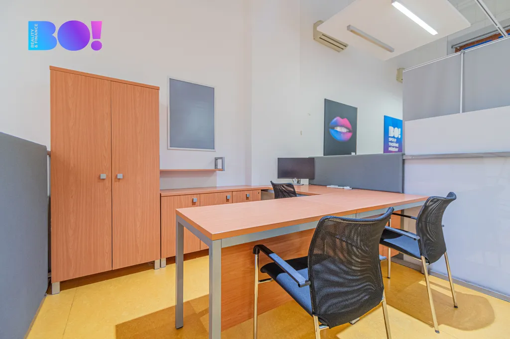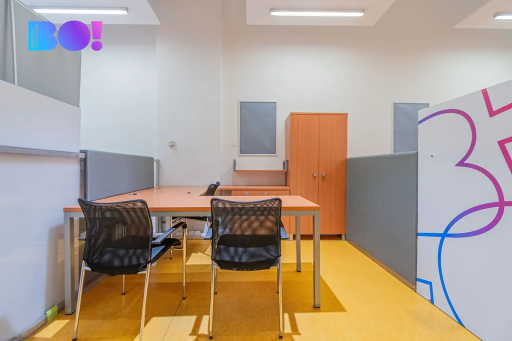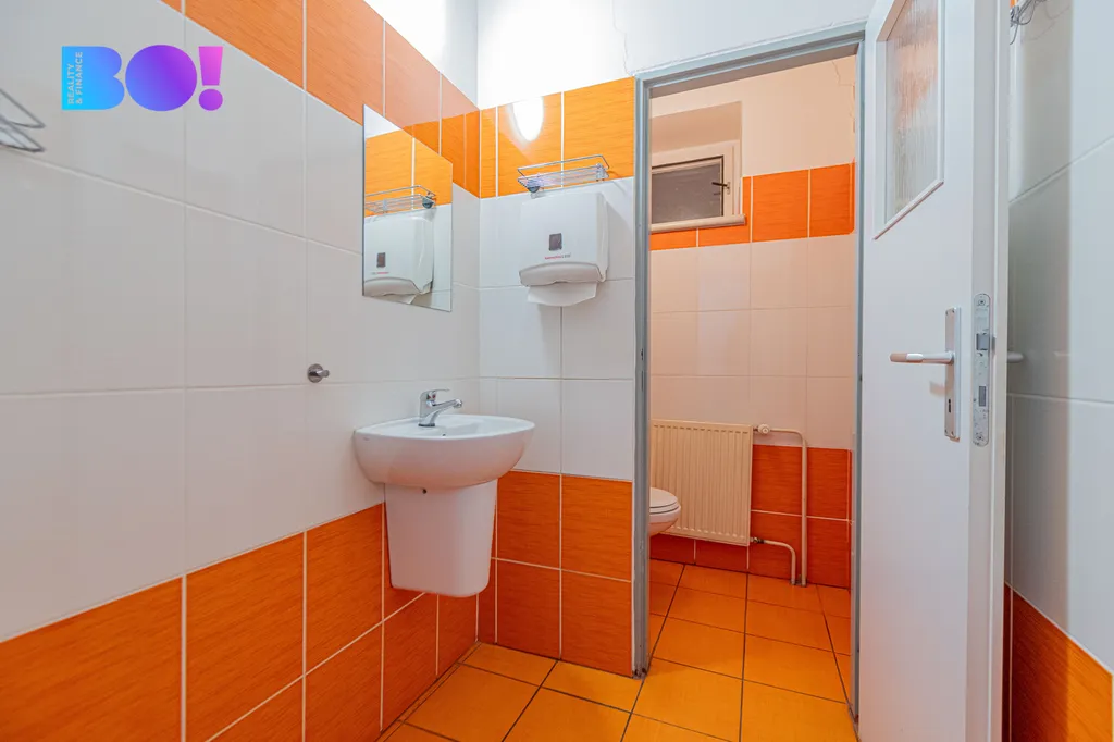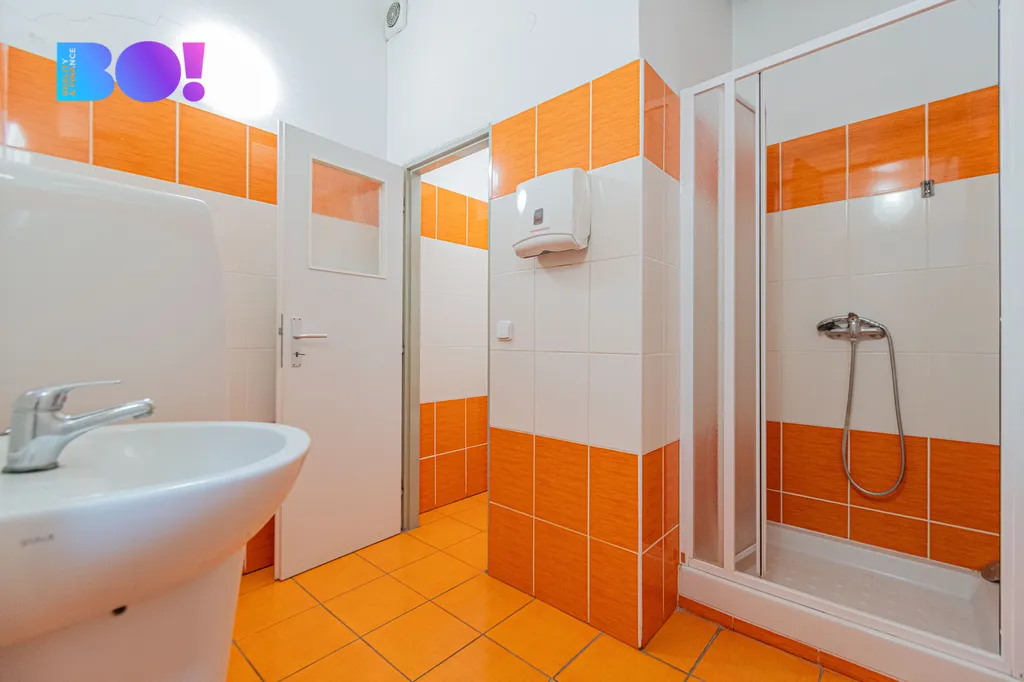 V zadní části o velikosti 73 m² jsou dvě menší samostatné kanceláře či místnosti na jednání (s jedním trezorem). Dále pak kuchyňka s myčkou, dvě WC (muži, ženy), sprchový kout. Do této zadní části vede i druhý bezbariérový vstup přes vnitřní uzamykatelný trakt. Zde je možné uschovat kola či elektro koloběžky.