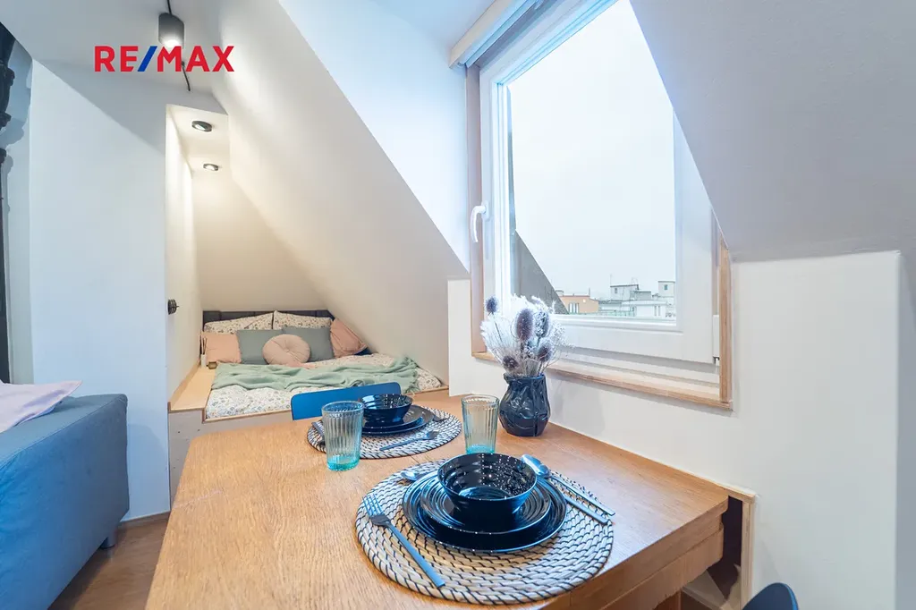Byt se nachází v nejvyšším patře bytového domu, takže nabízí příjemné světlo, vzdušnost a výhled, které u malometrážních bytů nebývají samozřejmostí.