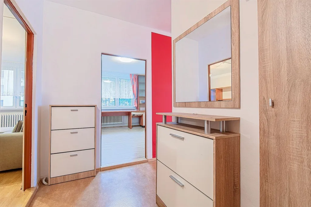 K disdpozici je i vybavení, jako např. v rámci kuchyně lednice s mrazákem, vestavná el. trouba, el. varná deska, digestoř, zařízená ložnice, z větší části zařízený obývací pokoj a třetí pokoj (viz. fotografie). Vytápění a phřev UV je vlastní ústřední plynové kotel na WC. Okna plastová.