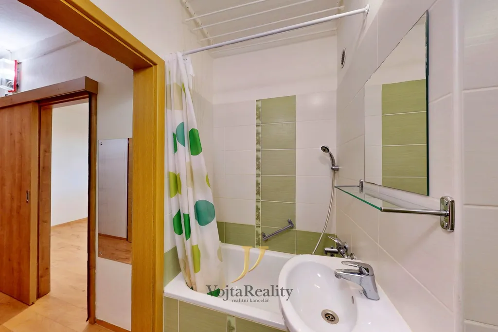 Byt je po částečné rekonstrukci. Byly provedeny nové obložky a interiérové dveře, položeny plovoucí podlahy, zrekonstruována elektroinstalace v kuchyni a koupelně a vybudována zcela nová koupelna. Dispozičně je řešen velmi prakticky – ze vstupní chodby je přístup do koupelny s WC, umyvadlem, vanou a místem pro pračku. Na chodbu navazuje prostorný obývací pokoj, ze kterého se vchází do kuchyně vybavené linkou se spotřebiči a dále také do samostatné ložnice. Součástí bytu je i sklepní kóje, která nabízí dostatek úložného prostoru.
