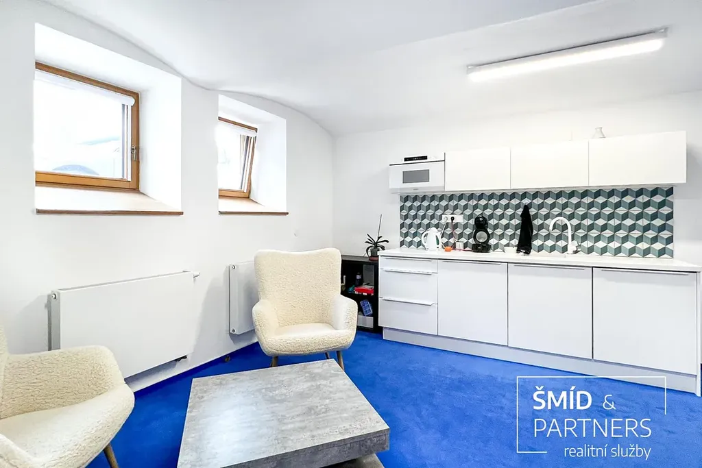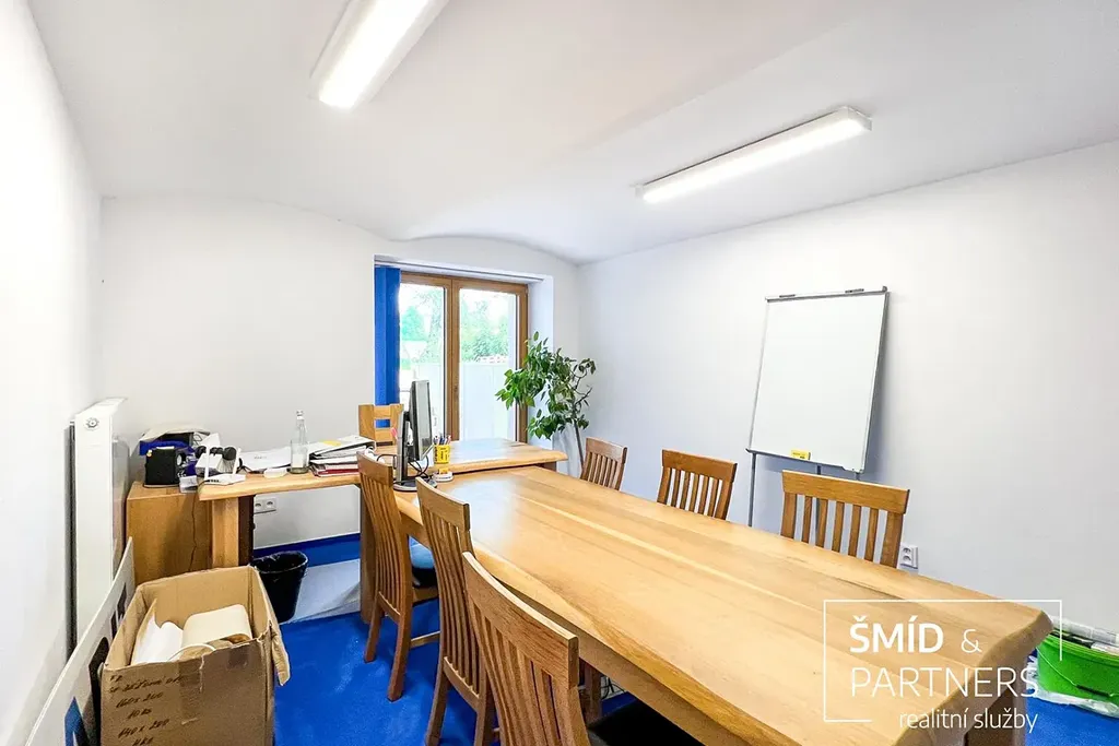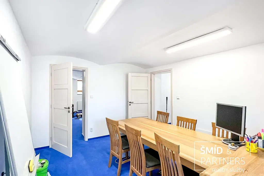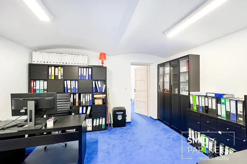 Kanceláře se nacházejí ve sníženém podlaží, a dvě z nich, které jsou směřované na zahradu, mají místo oken balkónové dveře. Velice praktická je průchodnost třech místností. Při vstupu první místnost po pravé straně funguje jako recepce a má k dispozici kuchyňku. Ponechání nábytku je o dohodě mezi současným a novým majitelem.