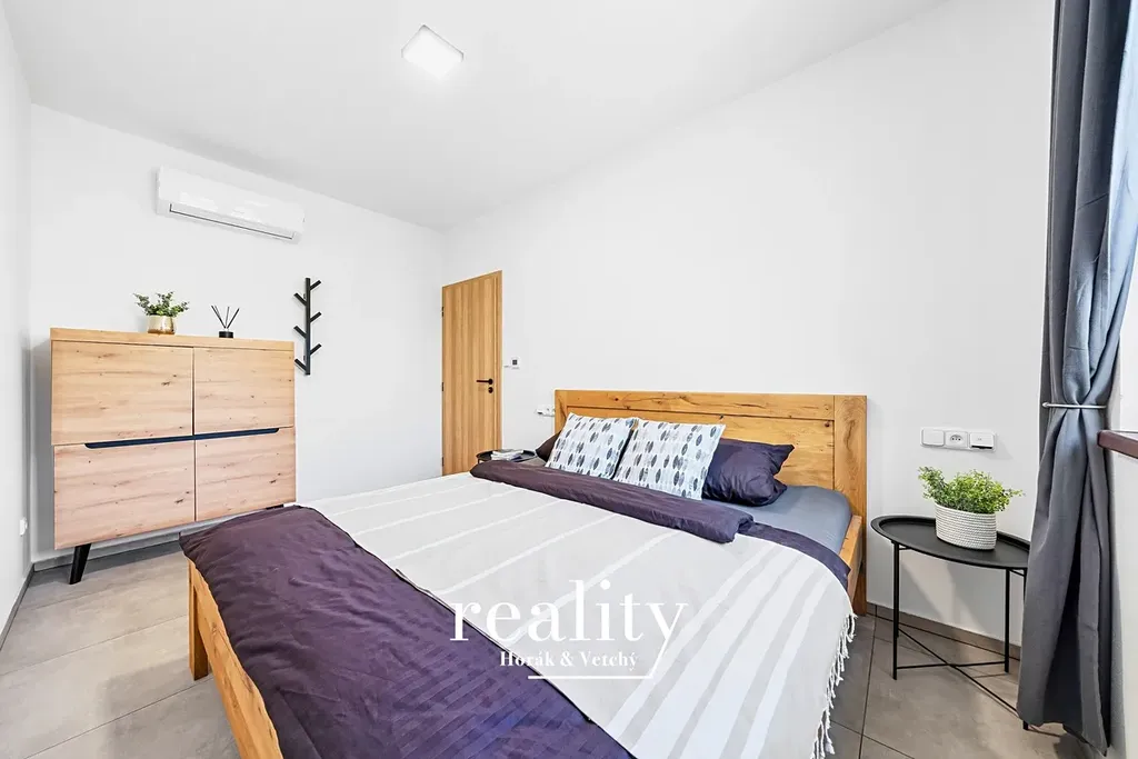 • Každý byt má dvě samostatné ložnice – jednu v hlavním podlaží, druhou ve špici podkroví, přístupnou po dřevěném schodišti (13,46 m²)