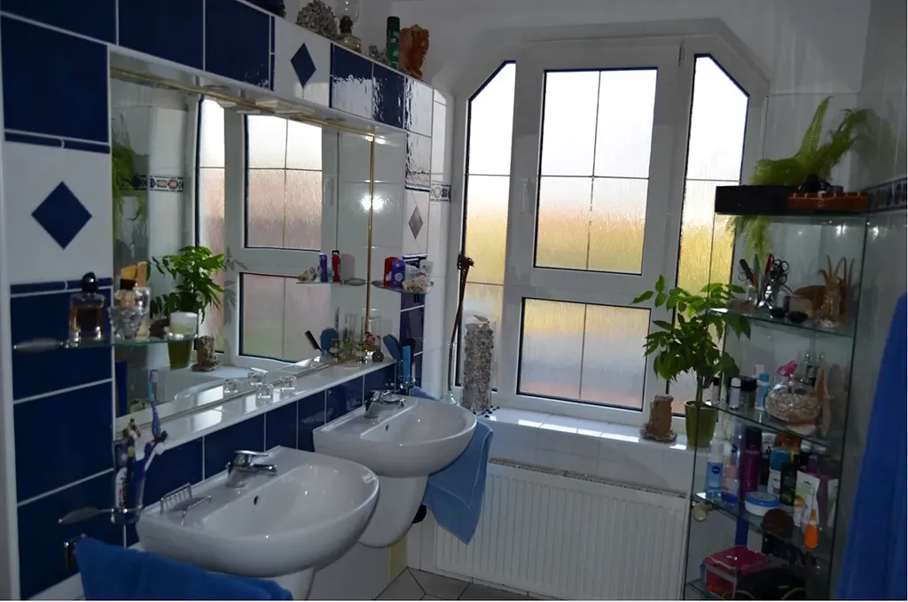 Koupelna je zařízena sprchovým koutem, dvěma umyvadly, velkoplošným zrcadlem s osvětlovací rampou, záchodem, bidetem, sušákem na ručníky, celková plocha 8m².