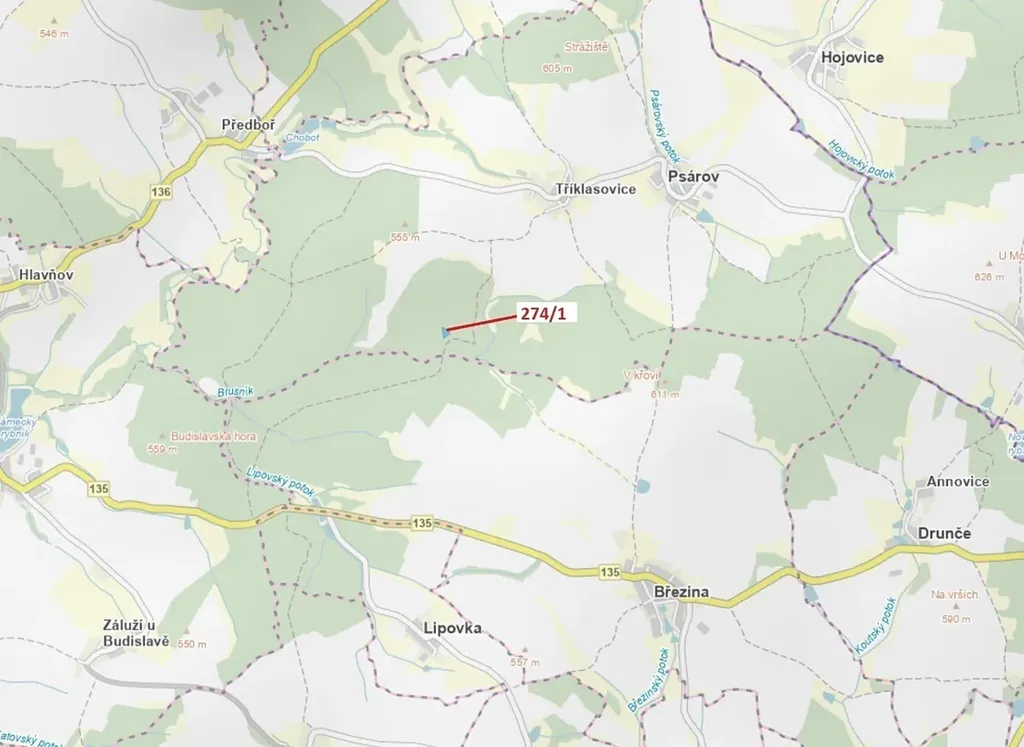 Lesní pozemek o výměře 2949 m2, parcelní číslo 274/1, podíl 1/1, katastrální území Tříklasovice, obec Psárov, obec s rozšířenou působností Tábor, okres Tábor, Jihočeský kraj. Po těžbě.