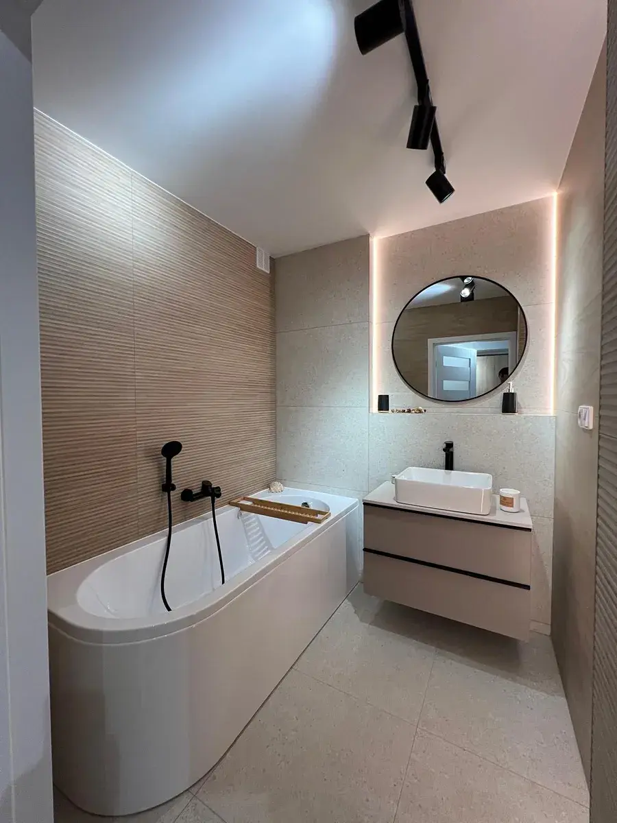Zděné bytové jádro, prostorná koupelna s velkoformátovými obklady a dlažbou disponuje vanou, toaleta je samostatná.