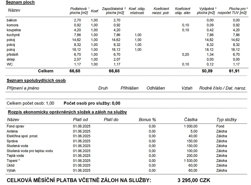 Měsíční poplatky činí pouze 3.295 Kč pro 1 osobu, z toho fond oprav 1.000 Kč.