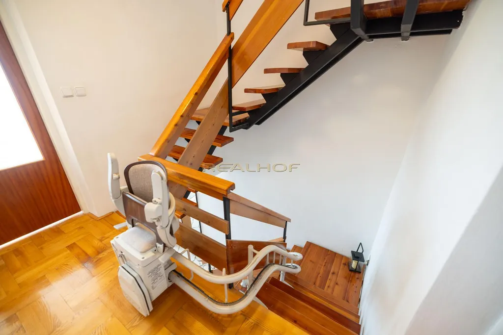 V prvním patře je prostorný obývací pokoj s velkým balkonem, kuchyně s jídelnou a vstupem na zahradu, koupelna s vanou a WC.