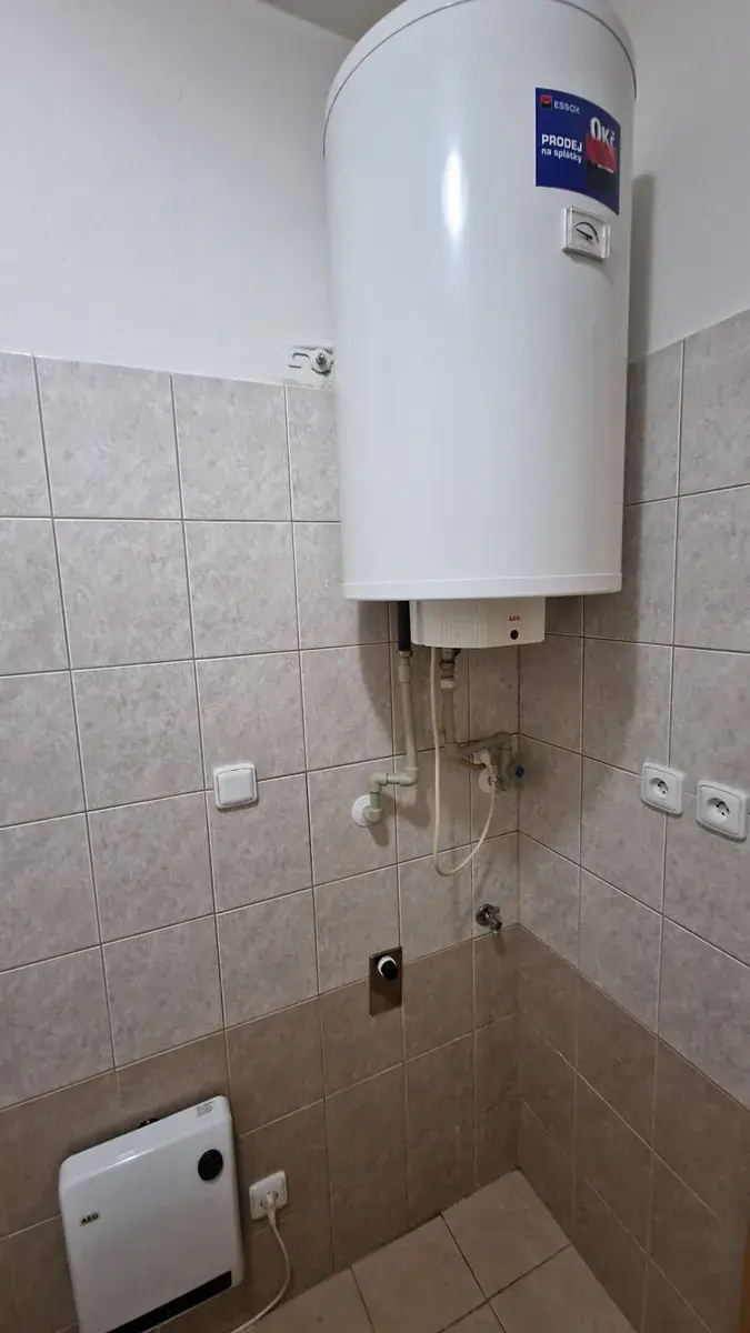 Koupelna disponuje sprchovým koutem, WC a umyvadlem. Ohřev vody zajištuje el. bojler a vytápění pak plynové těleso WAW. Podlahy jsou plovoucí v kombinaci s dlažbou.