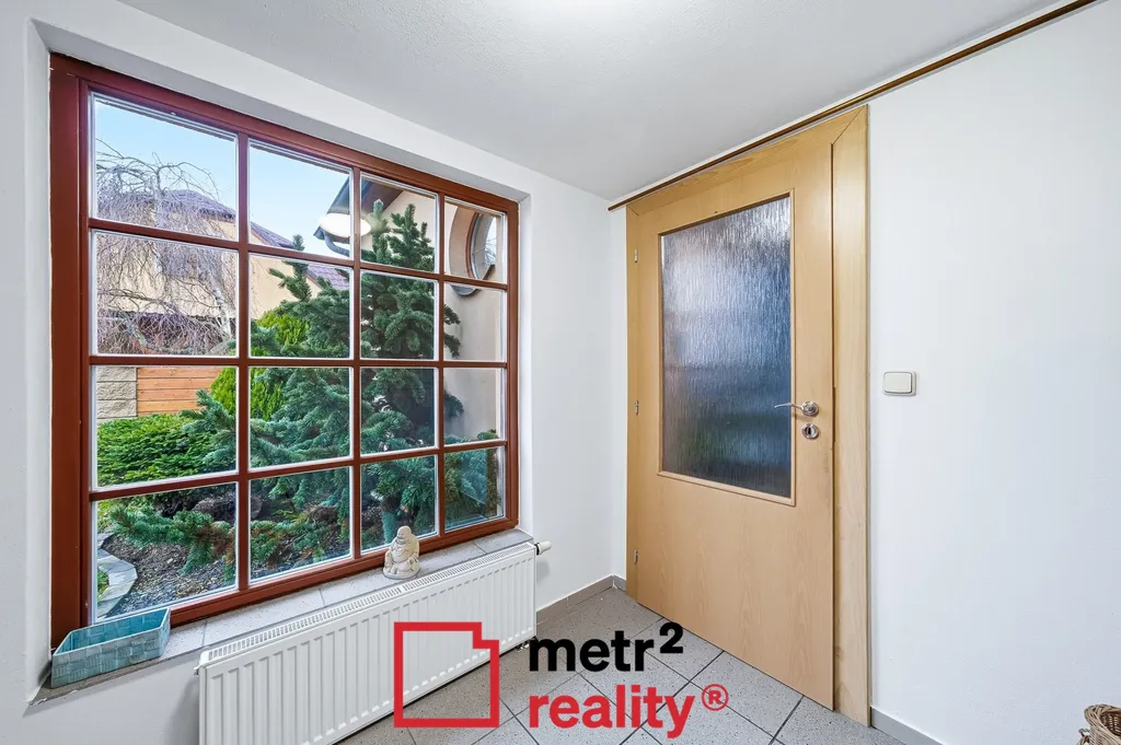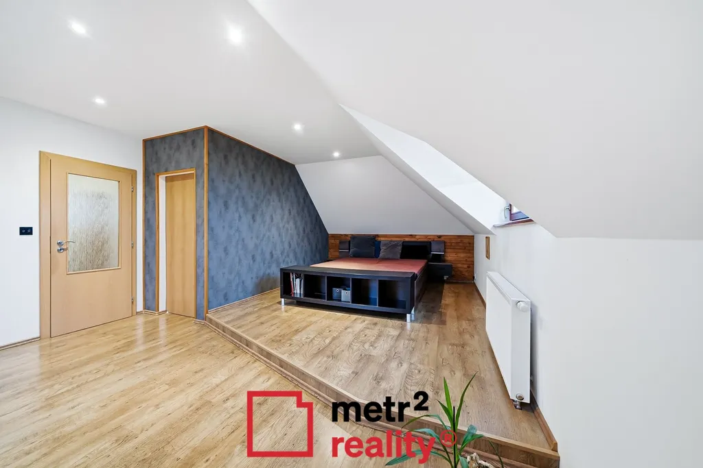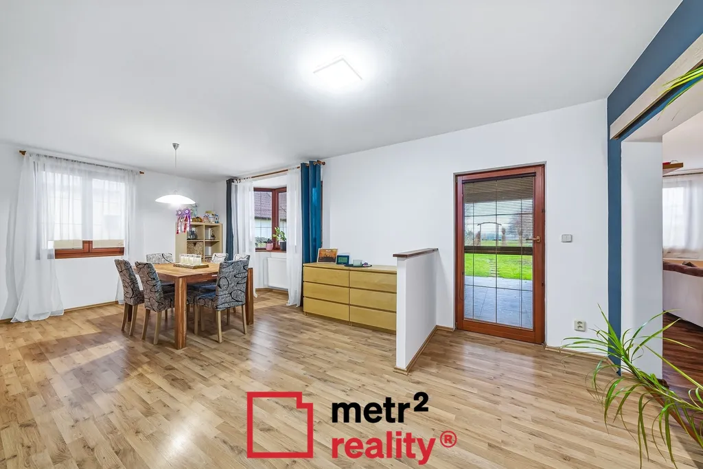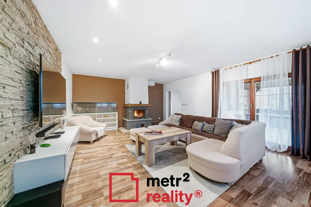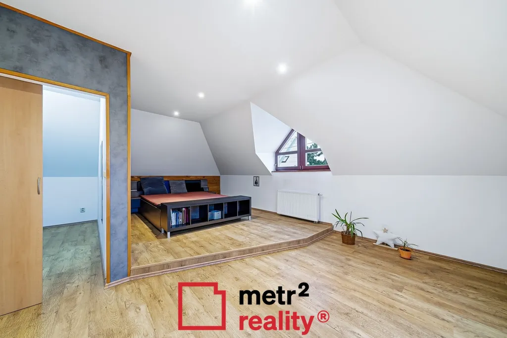 Dům je velmi prostorný a velmi dobře dispozičně vyřešený. V přízemí se nachází prostorné zádveří, kterým vejdete do hlavní obytné části, kuchyně s jídelnou a obývacího pokoje se zděným krbem. Krb je funkční a jsou z něj vyvedeny průduchy do horních pokojů. Na zastřešenou terasu se dostanete francouzským oknem jak z jídelny, tak obývacího pokoje. Dále se v přízemí nachází WC, koupelna se sprchovým koutem a dvěma umyvadly a garáž. Byl využit i prostor pod schody, ve kterém najdete spíž. Po dřevěném schodišti se dostanete do patra, kde se nachází další toaleta, technická místnost s pračkou a tři krásné velké pokoje o výměrách 28 m2, 19,6 m2 a 19,5 m2. V ložnici a jednom dětském pokoji se nacházejí jako bonus šatny o výměře 4,9 a 5,6 m2. Fotografie dětských pokojů jsme v inzerci nepoužili z důvodu zachování soukromí dětí, ale rádi Vám je ukážeme na osobní prohlídce. Dále je k dispozici půdní prostor, který může sloužit na uložení věcí. Dům má vlastní čističku napojenou na kanalizaci, samozřejmostí je elektřina a obecní vodovod. Vytápění i ohřev vody zajišťuje plynový kotel. Na pozemku je studna, která slouží na zalévání zahrady. Je nachystaná přípojka pro možnost užívání vody ze studny v domě.