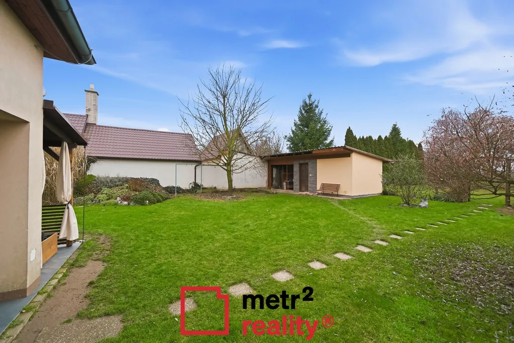 Obrovským bonusem je krásná zahrada o výměře 1339 m2, která je opticky rozdělena na dvě části, kdy část u domu je více okrasná a zadní část může sloužit jako užitková. Na zahradě je umístěna stavba, ve které se nachází kotec pro psa a zahradní domek na uložení zahradního nářadí či nábytku. Na pozemku se nachází několik krásných vzrostlých stromů, je kompletně oplocen a za zahradou se nahází už jen pole. Dům je totiž postaven na okraji obce v klidné ulici a nabízí svým obyvatelům maximální soukromí.