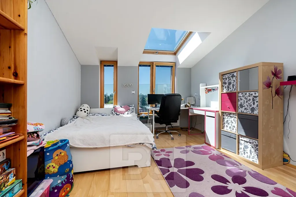 Exkluzivně nabízíme k prodeji velmi světlý byt 7+kk situovaný ve 3. patře (posledním) novostavby s výtahem v centru Průhonic, ul. Uhříněveská s přímým výhledem na místní zámek. Prostorný, slunný byt o celkové ploše 264 m2 se skládá z opravdu velkorysého obývacího pokoje s kuchyňským koutem kompletně vybaveným značkovými spotřebiči, dále pak ze šesti ložnic, dvou koupelen s vanou (jedna se sprchovým koutem) a WC, dvě samostatné toalety, dvě vstupní haly, komory a technické místnosti. Byt je velice vzdušný a světlý díky střešním oknům ve všech místnostech. Obývací pokoj je situovaný směrem do ulice s krásným výhledem na náměstí/zámek. Součástí vybavení bytu jsou vestavěné skříně, klimatizace v každém pokoji, vstupní video-telefon.