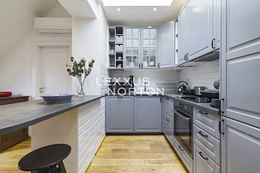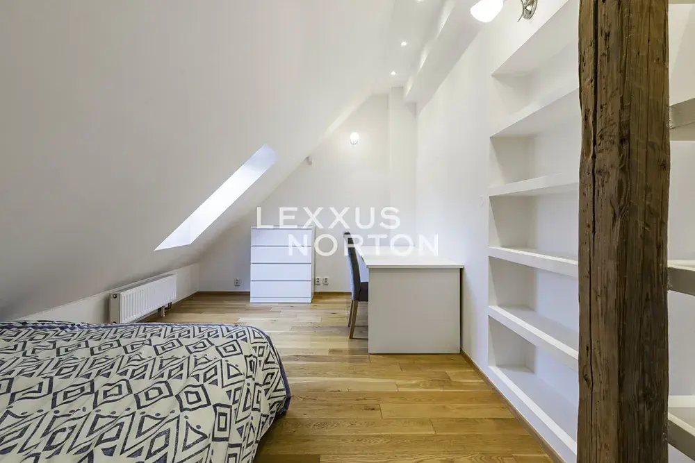 K pronájmu nabízíme útulný podkrovní byt, který nabízí komfortní a moderní bydlení. Dispozice zahrnuje vstupní chodbu, prostorný obývací pokoj s kuchyňským koutem a přímý vstup na velkou střešní terasu (90 m2). Hlavní ložnice disponuje šatnou, balkonem (4 m2) a vlastní koupelnou, druhá ložnice má balkon (4 m2) orientovaný do dvora, k bytu dále patří třetí ložnice a druhá koupelna. Ve dvoře domu je samostatná garáž za poplatek 4 500Kč/měsíc.