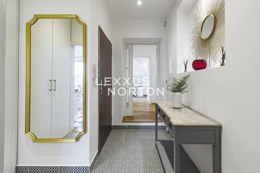 Vstupní chodba disponuje vestavěnými skříněmi. Kuchyňský kout je plně vybaven indukční varnou deskou, troubou, lednicí, mrazákem a myčkou nádobí. Součástí bytu je koupelna se sprchovým koutem a toaletou, druhá koupelna disponuje vanou, sprchovým koutem a toaletou. Byt je vybaven pračkou a klimatizací. Terasa nabízí krytý prosklený prostor se zatahovacími roletami, vytápěním a vyhrazeným místem pro grilování.