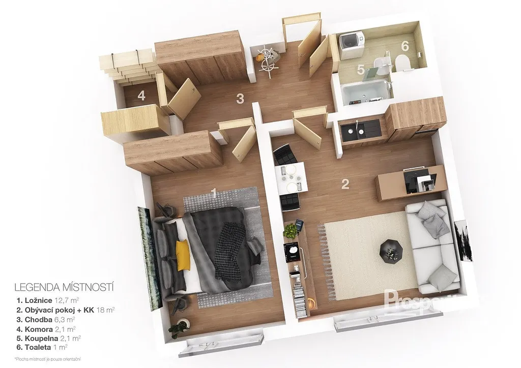 Praktická dispozice bytu vyhoví jednotlivci i páru.