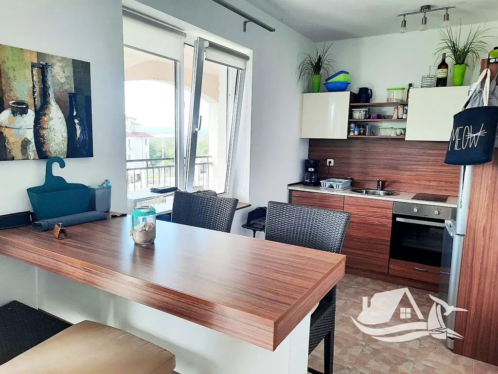 Apartmán se nachází ve zvýšeném prvním nadzemní podlaží a disponuje krásným výhledem na moře a vnitřní zelenou část komplexu. V okolí najdete vše potřebné pro pohodlné bydlení – obchod s potravinami, restauraci Čajka a další služby v docházkové vzdálenosti. Pláž je vzdálená pouhých 400 metrů, což znamená, že si můžete užívat moře každý den bez nutnosti dopravy.