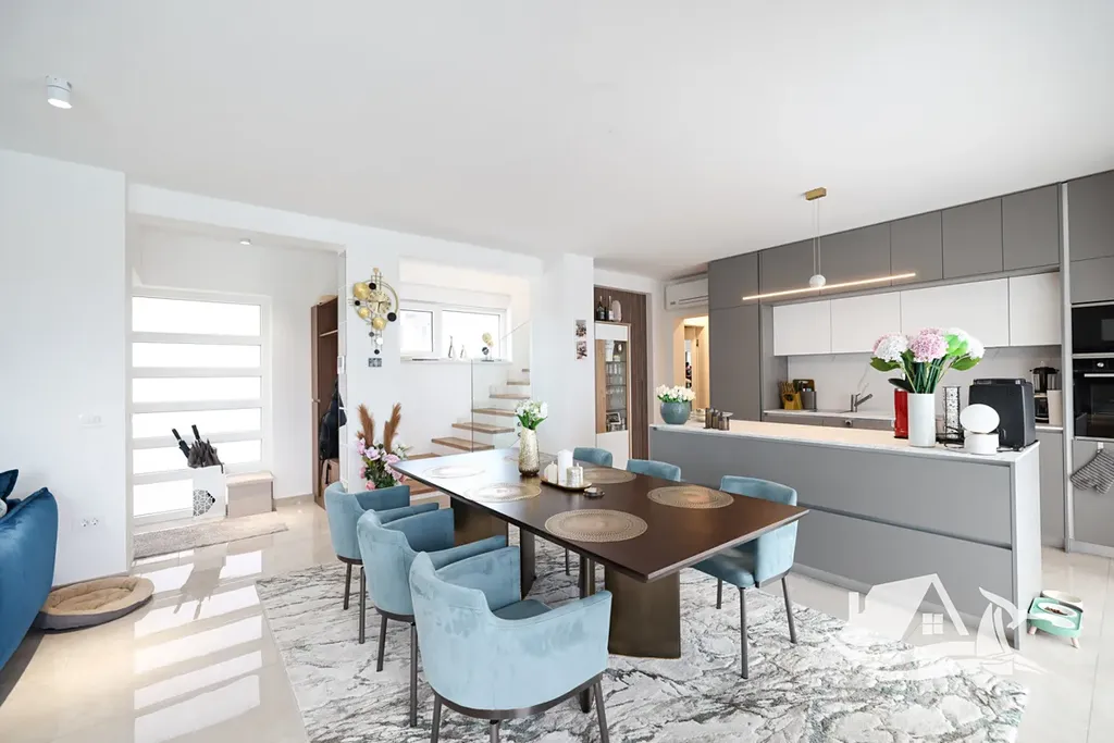 Celková čistá užitná plocha bez koeficientů je 196 m² a dům působí vzdušně, funkčně a velmi příjemně. Na zahradě čeká upravená zeleň, venkovní kuchyň s grilem na dřevo a vyhřívaný bazén 8×4 m se slanou vodou a automatickou regulací. Celý dům je vybaven podlahovým vytápěním i chlazením přes tepelné čerpadlo, kvalitní PVC okna mají elektrické rolety a fasáda z přírodního kamene dodává vile charakter i dlouhou životnost. Automatické zavlažování usnadňuje údržbu a celý dům se prodává kompletně vybavený, připravený k okamžitému užívání. Vlastnictví je zcela v pořádku.