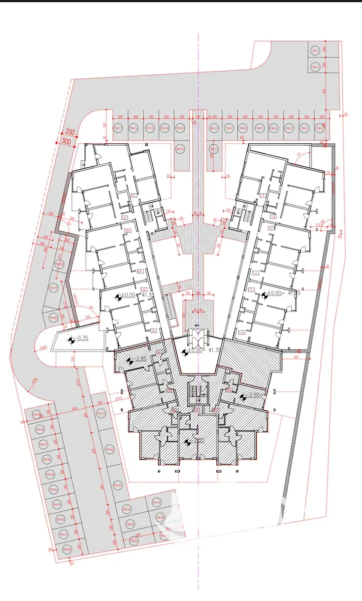 Kamenná fasáda, výtah, skleněná zábradlí, oplocení, parkovací místa