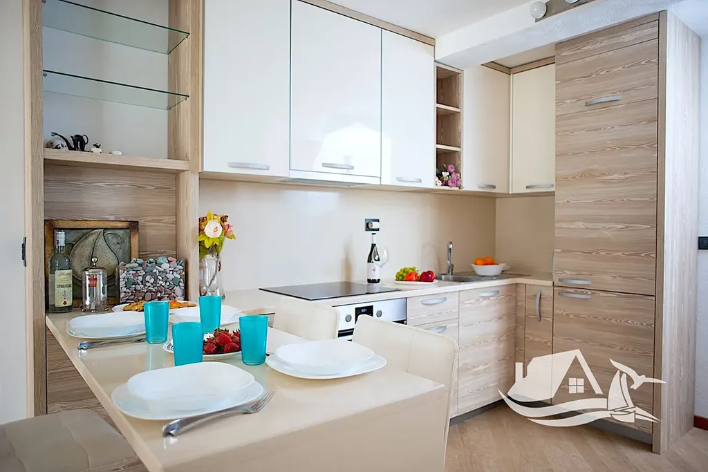 Apartmán má celkovou plochu 180 m² a je navržen s důrazem na pohodlí a praktičnost. Nacházejí se zde dvě prostorné ložnice a velká koupelna s luxusním sprchovým koutem. Hlavní chloubou této nemovitosti je terasa o rozloze 83 m², která nabízí jedinečné výhledy na hlavní atrakce regionu: ikonický ostrov Sveti Stefan, ostrov Sveti Nikola (známý jako Školský ostrov), majestátní balkánské hory a krásnou promenádu. Celý apartmán je plně zařízen a vybaven moderními spotřebiči, což umožňuje okamžité nastěhování.