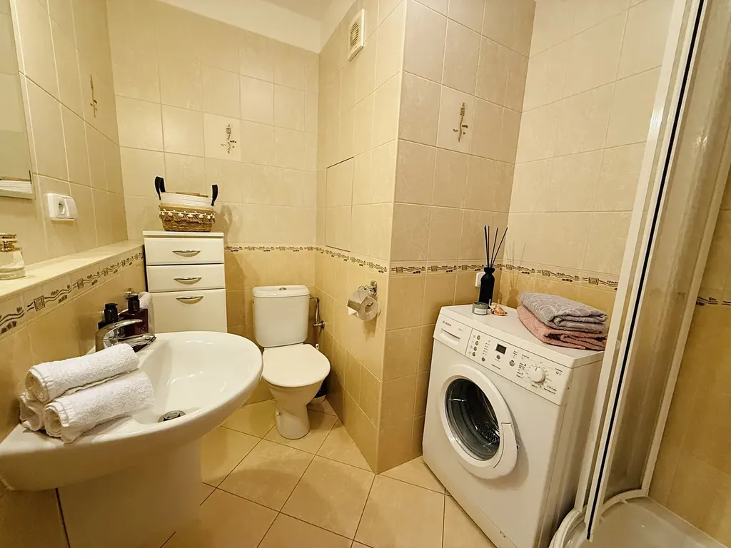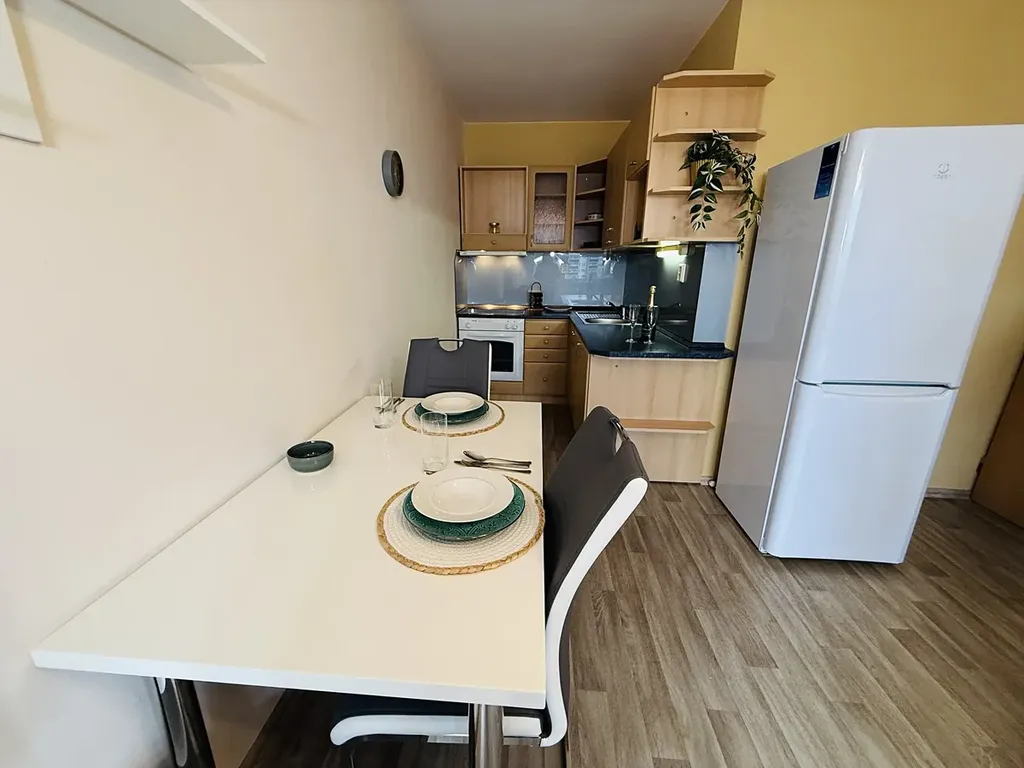 Byt je plně vybaven – kuchyňskou linkou s elektrickou varnou deskou a troubou, obývací stěnou s TV, pohodlnou sedací soupravou, manželskou postelí s nočními stolky, pračkou a množstvím úložných prostor.