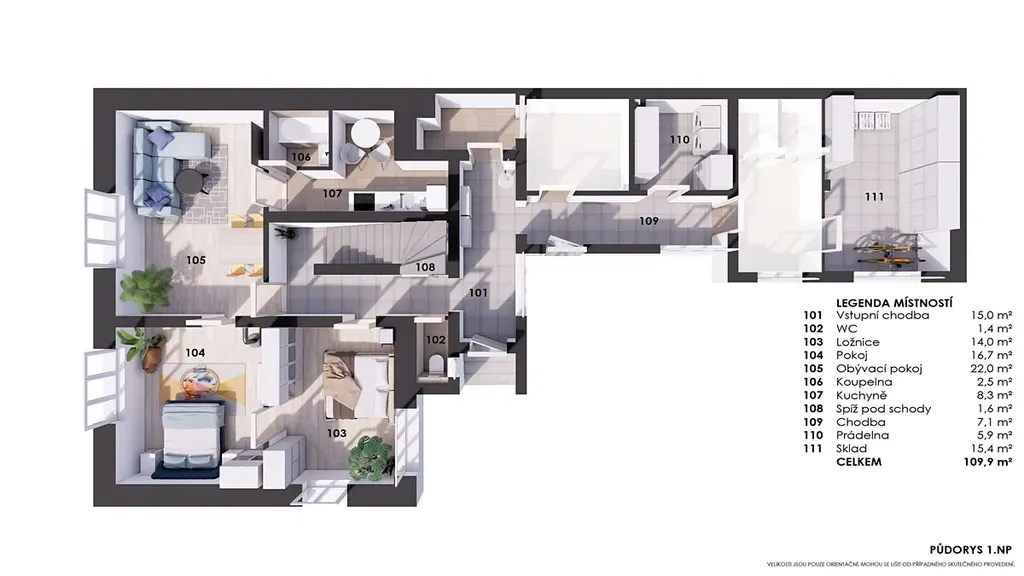 Přízemní byt o dispozici 3+1 se skládá z těchto částí: