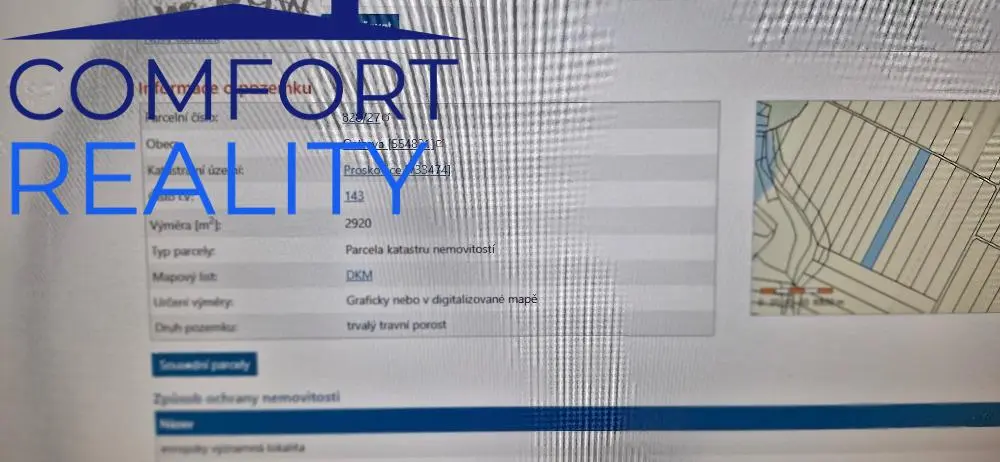 Prodej podílu 1/2 na trvalém travním porostu v Ostravě Proskovicích o výměře 2920m2. Takže na podíl připadá a kupující kupuje 1460m2.