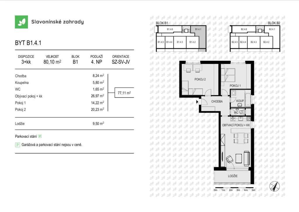 Nabízíme prostorný byt s označením B1.4.1 o dispozici 3+kk, podlahové ploše 80,1 m2 v 4. NP, s terasou 9,5 m2 ideální pro rodiny s dětmi, páry i milovníky venkovního života.