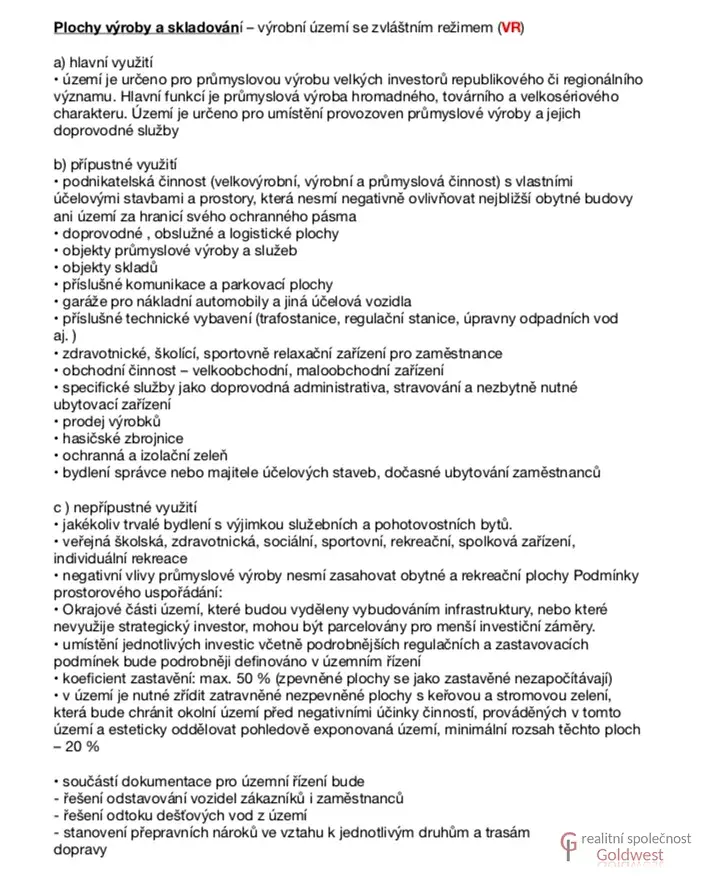 určeno pro průmyslovou výrobu velkých investorů republikového či regionálního významu, doprovodné služby, případně podnikatelská činnost výrobní a průmyslová, doprovodné a logistické plochy, objekty skladů, parkovací plochy apod., kdy koeficient zastavění je 50%, zpevněné plochy se jako zastavěné nezapočítávají. Sítě jsou umístěné v komunikaci pod tímto pozemkem.