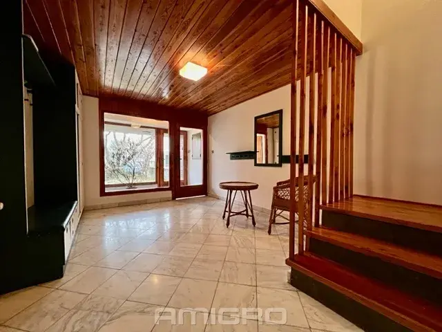 1. patro - obývací pokoj se vstupem na zahradu (31 m2), kuchyně se vstupem na terasu (20 m2), spíž, koupelna s vanou, toaleta